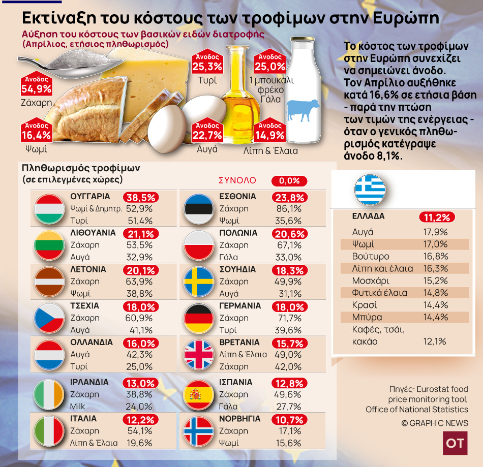 Οι τιμές των τροφίμων στην ΕΕ αυξήθηκαν κατά 16,6% τον Απρίλιο σε ετήσια βάση, σύμφωνα με τη Eurostat, δηλαδή με διπλάσιο ρυθμό έναντι του γενικού πληθωρισμού που διαμορφώθηκε στο 8,1%. Ορισμένες από τις μεγαλύτερες αυξήσεις σημειώθηκαν στις τιμές των βασικών ειδών διατροφής, με το κόστος των αυγών να αυξάνεται κατά 22,7%, το φρέσκο γάλα κατά 25% και η ζάχαρη κατά 54,9%.