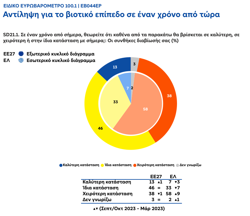 Σε ερώτηση του Ευρωβαρόμετρου σχετικά με το αν σε ένα χρόνο από τώρα θα έχει βελτιωθεί το βιοτικό επίπεδο τους, το 58% των Ελληνών πιστεύουν πως θα βρίσκονται σε χειρότερη κατάσταση, το 33% θεωρούν πως θα είναι ίδια η κατάσταση, το 7% θεωρεί ότι θα βελτιωθεί το επίπεδο και το 2% δεν απάντησε στην ερώτηση.