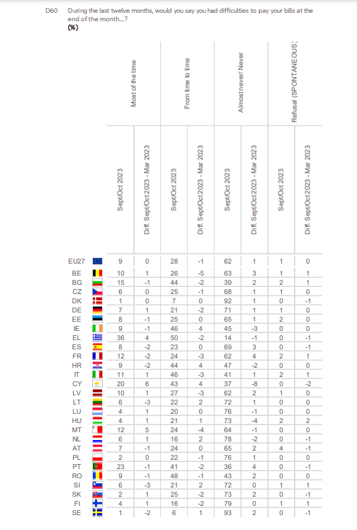Στην ίδια ερώτηση, το 62% των πολιτών άλλων κρατών μελών απαντούν πως δεν αντιμετωπίζουν προβλήματα στην πληρωμή των λογαριασμών, το 28% λέει ότι αντιμετωπίζει κατά καιρούς, το 9% αναφέρει πως τις περισσότερες φορές έχει ζητήματα στην διαχείριση των οικονομικών του και το 1% δεν απάντησε στην ερώτηση.