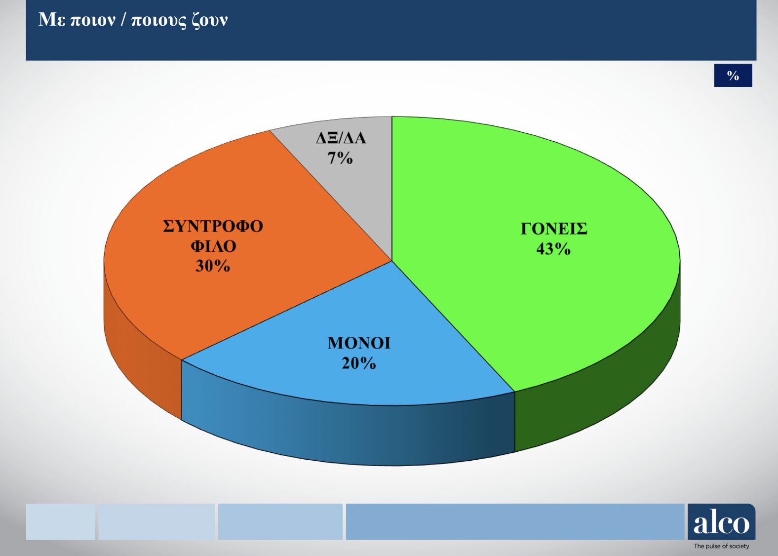 Η έρευνα αποκαλύπτει πως σχεδόν οι μισοί νέοι που συμμετείχαν (43%) εξακολουθούν να ζουν με τους γονείς τους, ενώ το 30% συγκατοικεί με σύντροφο ή φίλο και μόλις το 20% ζει μόνο του.
