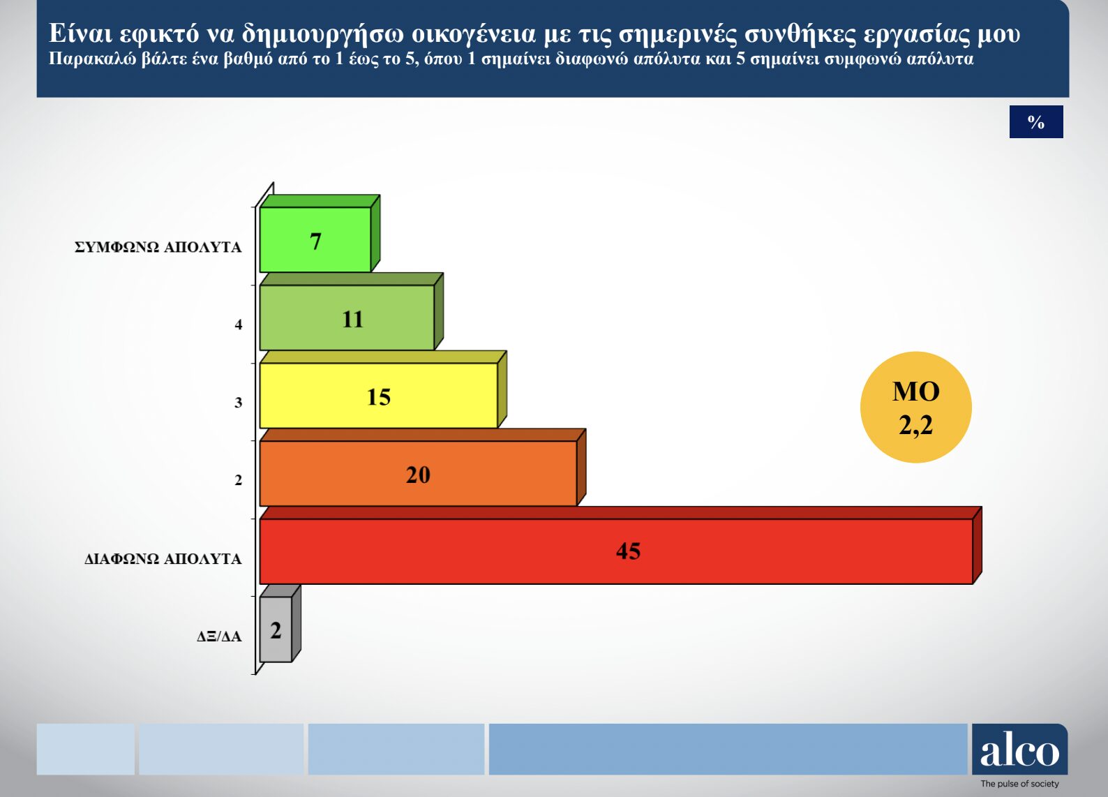 Οι συνθήκες εργασίας φαίνεται να μην ικανοποιούν τους νέους, γεγονός που επηρεάζει και τη διάθεσή τους να δημιουργήσουν οικογένεια. Σχεδόν οι μισοί (45%) «διαφωνούν απόλυτα» με την προοπτική αυτή, ενώ μόλις το 7% «συμφωνεί απόλυτα».