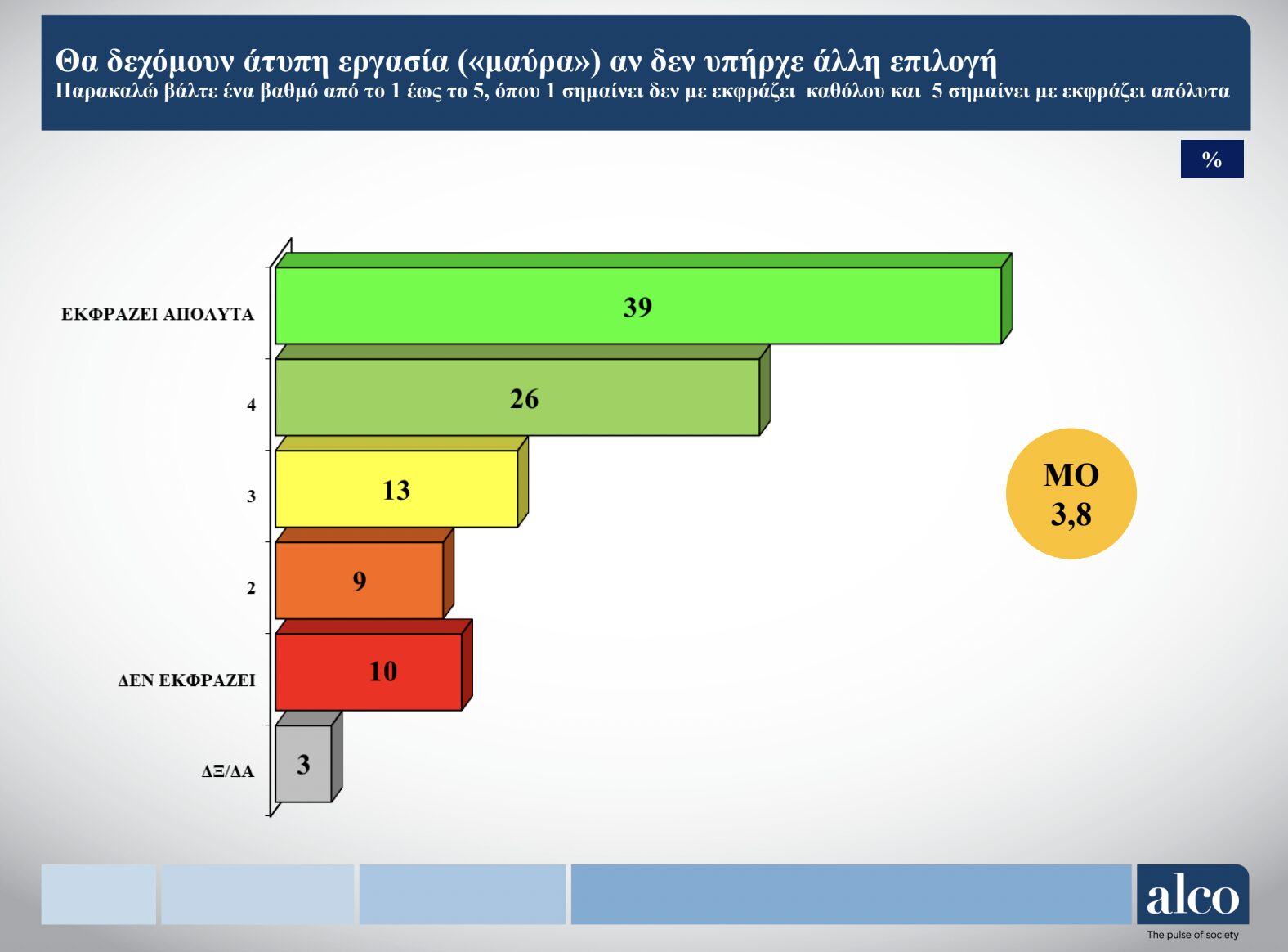Με έναν υψηλό μέσο όρο 3,8/5, οι νέοι δηλώνουν πως θα δέχονταν να εργαστούν «μαύρα» — δηλαδή χωρίς ασφάλιση ή νόμιμη σύμβαση — αν δεν υπήρχε άλλη επιλογή.