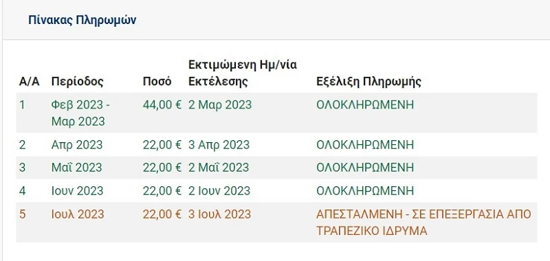 Υπάρχει μία υποσημείωση η οποία αναφέρει πως: Πληρωμές σε κατάσταση: ΑΠΕΣΤΑΛΜΕΝΗ – ΣΕ ΕΠΕΞΕΡΓΑΣΙΑ ΑΠΟ ΤΡΑΠΕΖΙΚΟ ΙΔΡΥΜΑ έχουν αποσταλεί στο τραπεζικό ίδρυμα και η επεξεργασία τους μπορεί να διαρκέσει έως 10 εργάσιμες ημέρες.