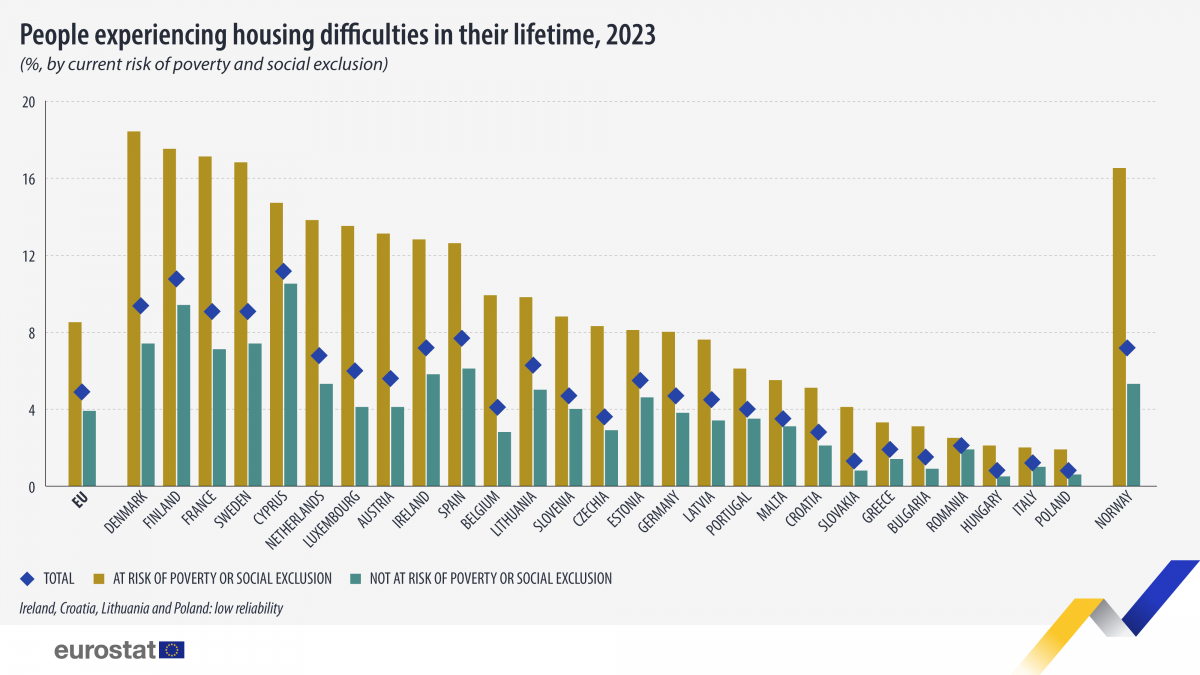 Το 4 ,9% των ατόμων ηλικίας 16 ετών και άνω στην ΕΕ ανέφεραν ότι αντιμετώπισαν δυσκολίες στέγασης κατά τη διάρκεια της ζωής τους. Για τα άτομα που βρίσκονται σε κίνδυνο φτώχειας ή κοινωνικού αποκλεισμού, τα ποσοστά όσων αντιμετωπίζουν δυσκολίες στέγασης είναι σχεδόν διπλάσια, στο 8,5%. Αντίστοιχα, δυσκολίες ενοικίασης αντιμετωπίζει το 13% του πληθυσμού άνω των 16 ετών και το 23,3% όσων βρίσκονται σε κίνδυνο φτώχειας.