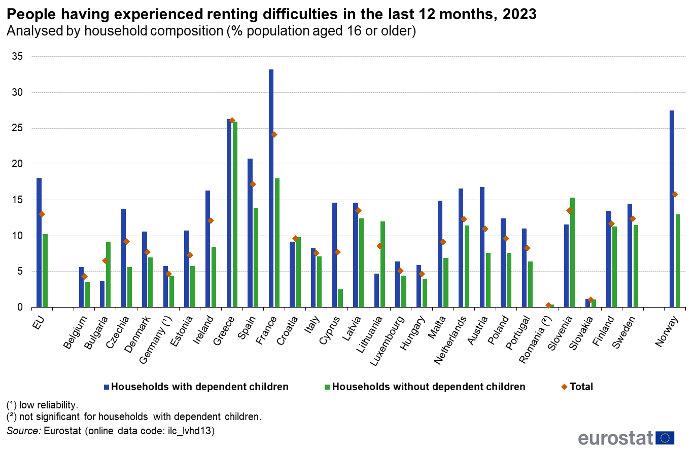 Στον μέσο όρο των χωρών της ΕΕ, το 18,1% των νοικοκυριών με εξαρτώμενα παιδιά δεν μπορούν να πληρώσουν το ενοίκιο με δικά τους χρήματα. Το 2023, το 13,0% του πληθυσμού της ΕΕ ηλικίας 16 ετών και άνω ανέφερε δυσκολίες.