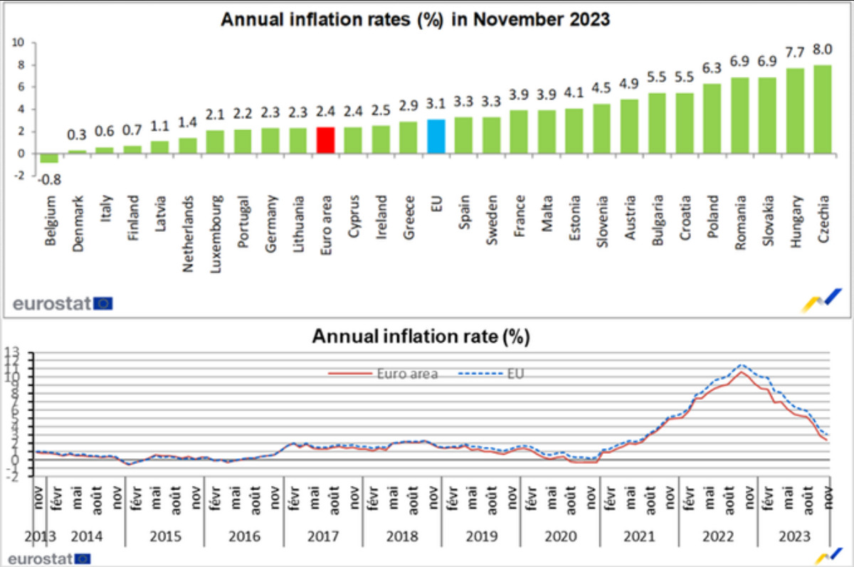 Στο σύνολο της Ε.Ε., ο πληθωρισμός τον Νοέμβριο ανήλθε στο 3,1% από 3,6% τον Οκτώβριο, ενώ έναν χρόνο πριν ανερχόταν στο 11,1%.