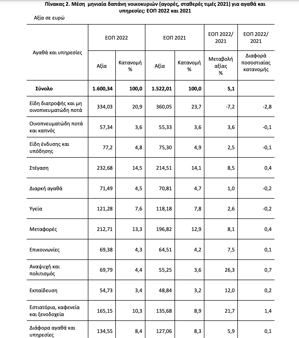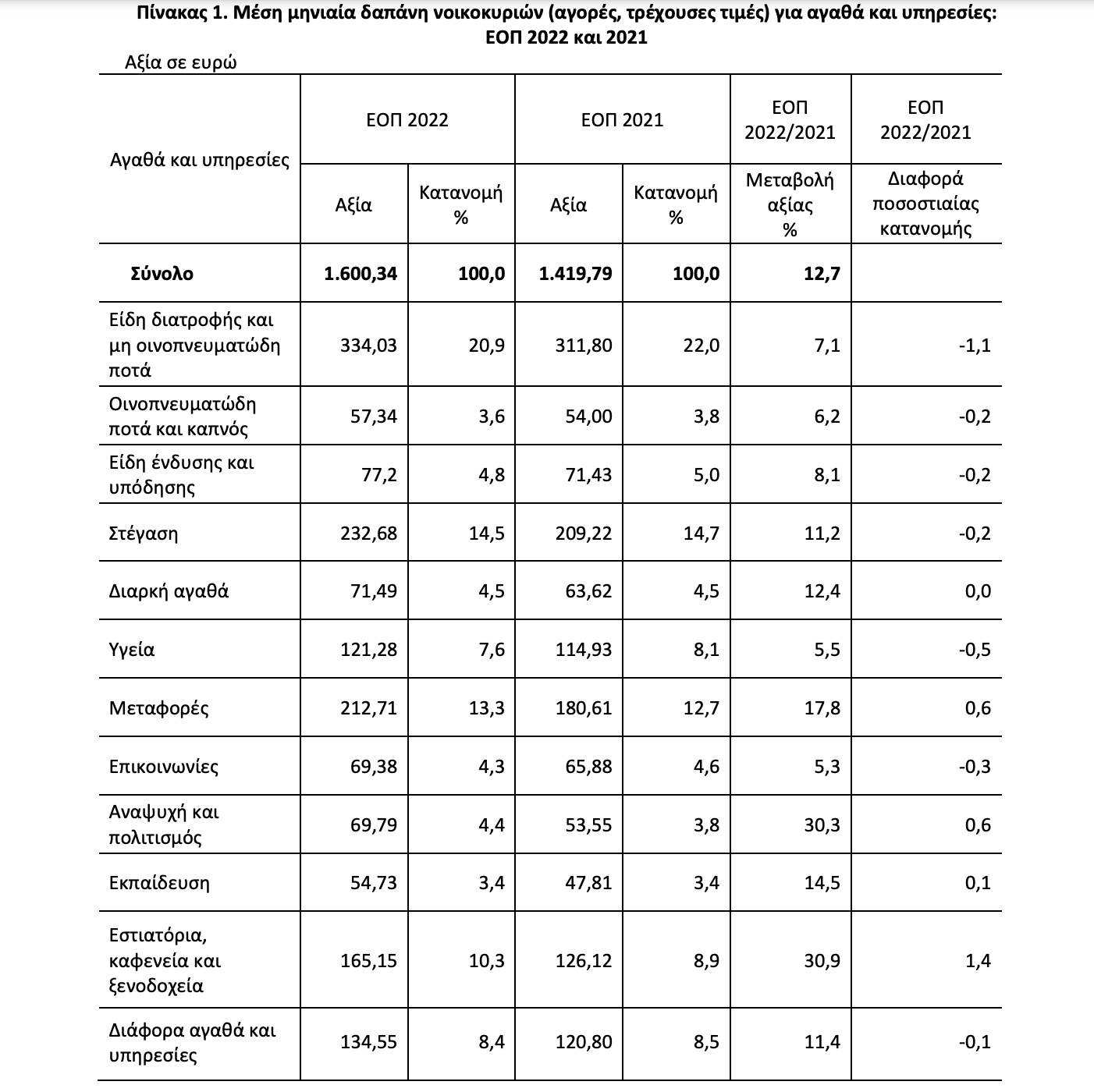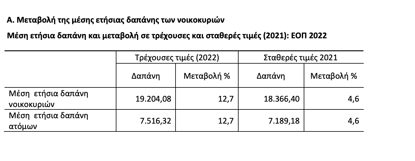 Η μέση ετήσια δαπάνη των νοικοκυριών για αγορές, κατά το έτος 2022, ανήλθε στα 19.204,08 ευρώ (1.600,34 το μήνα), καταγράφοντας αύξηση, σε τρέχουσες τιμές 12,7%, σε σχέση με το 2021. Το 50% των νοικοκυριών δαπανούν περισσότερα από 1.289 ευρώ το μήνα. Τα νοικοκυριά που διαμένουν σε ενοικιασμένη κατοικία δαπανούν το 17,4% του προϋπολογισμού τους, κατά μέσο όρο, για ενοίκιο. Το μερίδιο της μέσης δαπάνης για είδη διατροφής και μη οινοπνευματώδη ποτά και στέγαση των νοικοκυριών του φτωχότερου 20% του πληθυσμού ανέρχεται στο 58,1% των δαπανών των νοικοκυριών, ενώ το αντίστοιχο μερίδιο του πλουσιότερου 20% του πληθυσμού ανέρχεται στο 25,6%. Η υψηλότερη μέση ετήσια δαπάνη καταγράφηκε στην Περιφέρεια Αττικής και ανήλθε σε 22.305,84 ευρώ, ενώ η χαμηλότερη στην Περιφέρεια Στερεάς Ελλάδος και ανήλθε σε 13.828,56 ευρώ. Η μέση ετήσια δαπάνη των νοικοκυριών το 2022 εμφανίζεται μειωμένη κατά 24,5% σε σύγκριση με το 2008. Α. Μεταβολή της μέσης ετήσιας δαπάνης των νοικοκυριών Μέση ετήσια δαπάνη και μεταβολή σε τρέχουσες και σταθερές τιμές (2021): ΕΟΠ 2022