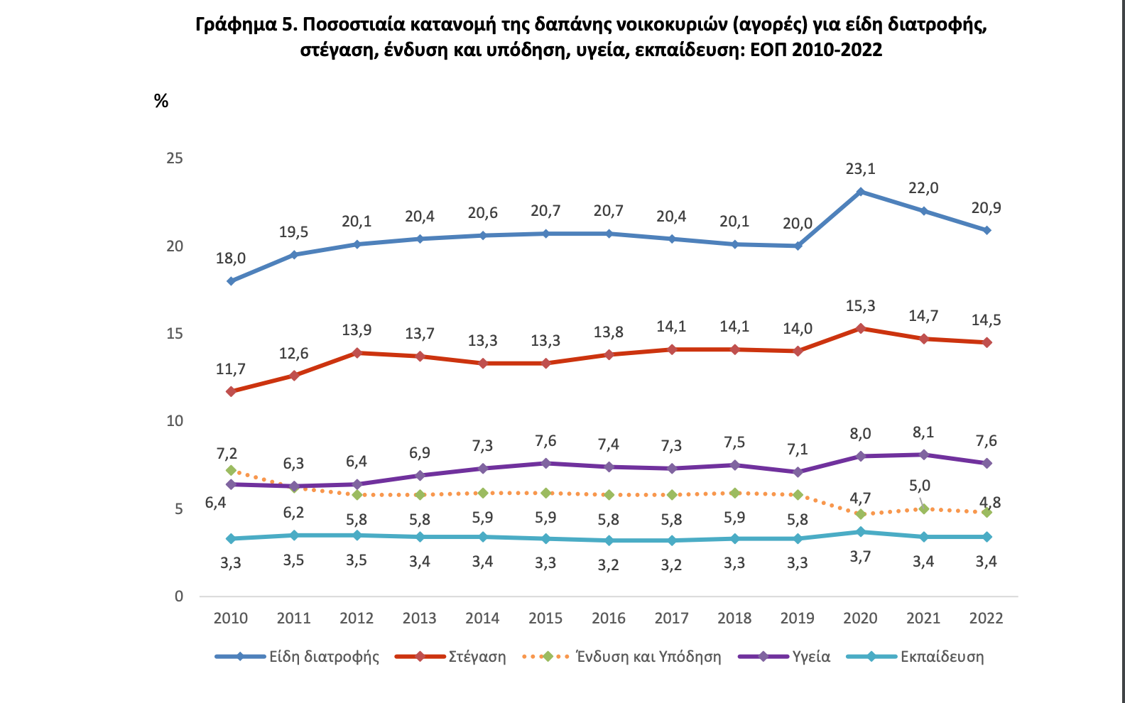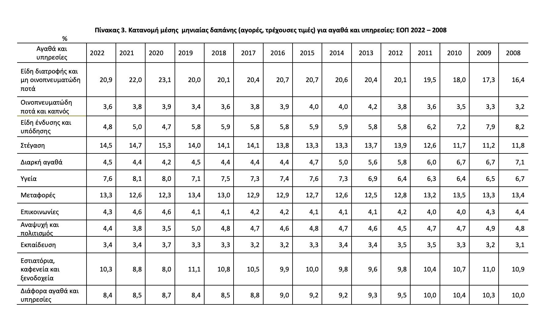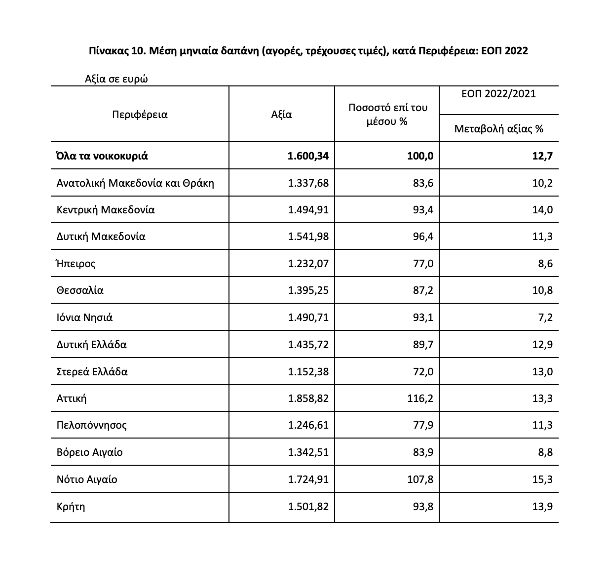 Η μέση ετήσια δαπάνη των νοικοκυριών για αγορές, κατά το έτος 2022, ανήλθε στα 19.204,08 ευρώ (1.600,34 το μήνα), καταγράφοντας αύξηση, σε τρέχουσες τιμές 12,7%, σε σχέση με το 2021. Το 50% των νοικοκυριών δαπανούν περισσότερα από 1.289 ευρώ το μήνα. Τα νοικοκυριά που διαμένουν σε ενοικιασμένη κατοικία δαπανούν το 17,4% του προϋπολογισμού τους, κατά μέσο όρο, για ενοίκιο. Το μερίδιο της μέσης δαπάνης για είδη διατροφής και μη οινοπνευματώδη ποτά και στέγαση των νοικοκυριών του φτωχότερου 20% του πληθυσμού ανέρχεται στο 58,1% των δαπανών των νοικοκυριών, ενώ το αντίστοιχο μερίδιο του πλουσιότερου 20% του πληθυσμού ανέρχεται στο 25,6%. Η υψηλότερη μέση ετήσια δαπάνη καταγράφηκε στην Περιφέρεια Αττικής και ανήλθε σε 22.305,84 ευρώ, ενώ η χαμηλότερη στην Περιφέρεια Στερεάς Ελλάδος και ανήλθε σε 13.828,56 ευρώ. Η μέση ετήσια δαπάνη των νοικοκυριών το 2022 εμφανίζεται μειωμένη κατά 24,5% σε σύγκριση με το 2008. Α. Μεταβολή της μέσης ετήσιας δαπάνης των νοικοκυριών Μέση ετήσια δαπάνη και μεταβολή σε τρέχουσες και σταθερές τιμές (2021): ΕΟΠ 2022