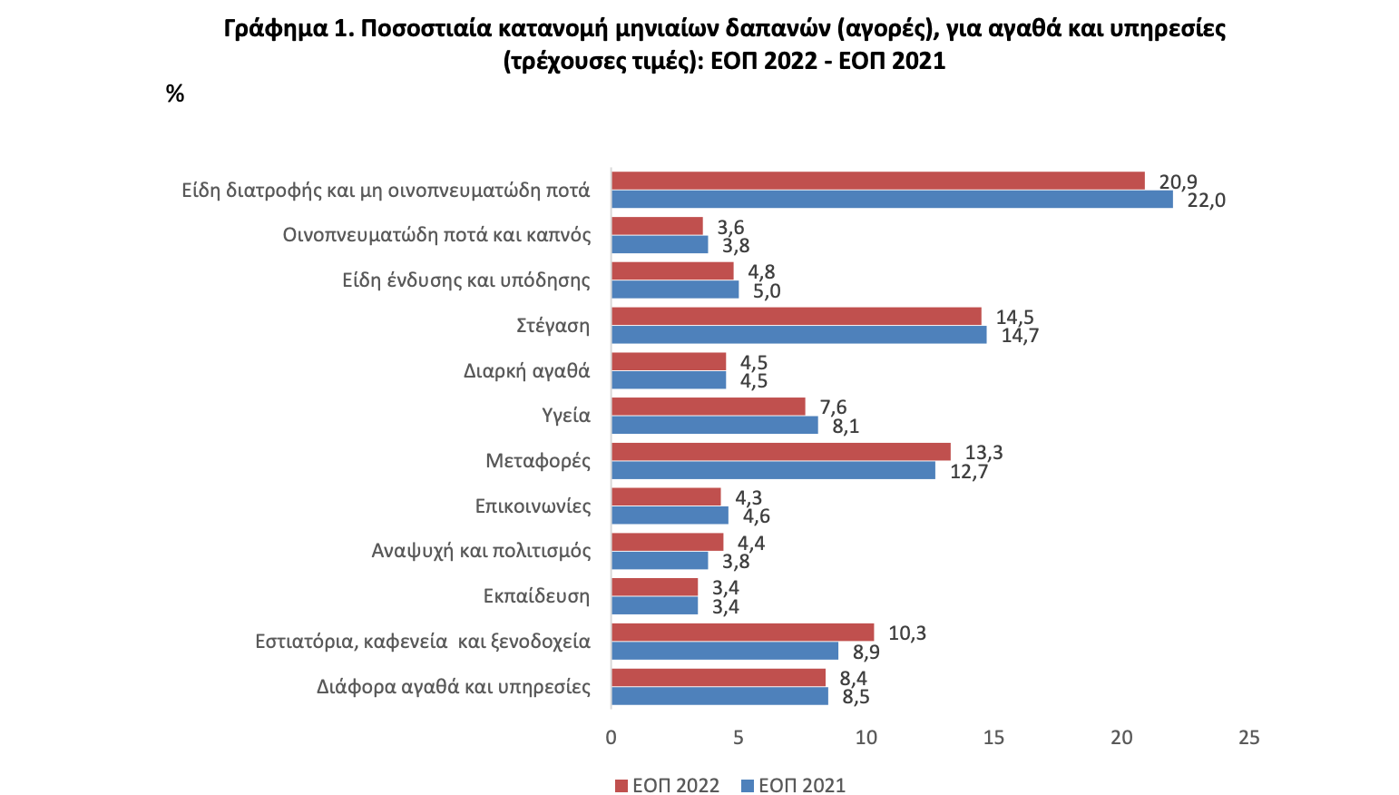 Η μέση ετήσια δαπάνη των νοικοκυριών για αγορές, κατά το έτος 2022, ανήλθε σε 19.204,08 ευρώ (1.600,34 το μήνα), καταγράφοντας ετήσια αύξηση 12,7% (2.166,60 ευρώ) σε σχέση με το 2021. Σε σταθερές τιμές, η μέση ετήσια δαπάνη των νοικοκυριών αυξήθηκε σε ποσοστό 4,6% ή 837,68 ευρώ, λόγω της επίδρασης του πληθωρισμού, σύμφωνα με τον Δείκτη Τιμών Καταναλωτή έτους 2022 που ήταν 7,2%. Η μέση ετήσια δαπάνη για κάθε άτομο, το 2022, ανήλθε στα 7.516,32 ευρώ, καταγράφοντας αύξηση 12,7% (847,32 ευρώ ετησίως) σε σύγκριση με το 2021 (6.669,00 ευρώ). Β. Βασικές διαπιστώσεις Tο μεγαλύτερο μερίδιο των δαπανών του μέσου προϋπολογισμού των νοικοκυριών, σε τρέχουσες τιμές, αφορά: o στα είδη διατροφής και μη οινοπνευματώδη ποτά (20,9%), o στη στέγαση (14,5%) και o στις μεταφορές (13,3%), ενώ το μικρότερο μερίδιο των δαπανών (3,4%) αντιστοιχεί στις υπηρεσίες εκπαίδευσης (Πίνακας 1). Γράφημα 1. Ποσοστιαία κατανομή μηνιαίων δαπανών (αγορές), για αγαθά και υπηρεσίες (τρέχουσες τιμές): ΕΟΠ 2022 – ΕΟΠ 2021 % Η μεγαλύτερη ποσοστιαία αύξηση δαπανών των νοικοκυριών, σε σχέση με την προηγούμενη έρευνα (2021), παρουσιάζεται (Πίνακας 1) σε: o εστιατόρια, καφενεία και ξενοδοχεία (30,9%), o αναψυχή και πολιτισμό (30,3%), o μεταφορές (17,8%), ενώ η μικρότερη ποσοστιαία αύξηση καταγράφεται στις επικοινωνίες (5,3%). Η μεγαλύτερη θετική μεταβολή στην ποσοστιαία συμμετοχή των διαφόρων δαπανών σε σταθερές τιμές 2022, σε σχέση με την προηγούμενη έρευνα του έτους 2021, παρατηρείται στα εστιατόρια, καφενεία και ξενοδοχεία (1,4 ποσοστιαίες μονάδες), ενώ η μεγαλύτερη ποσοστιαία μείωση συμμετοχής παρατηρείται στα είδη διατροφής και μη οινοπνευματώδη ποτά (-1,1 ποσοστιαίες μονάδες)