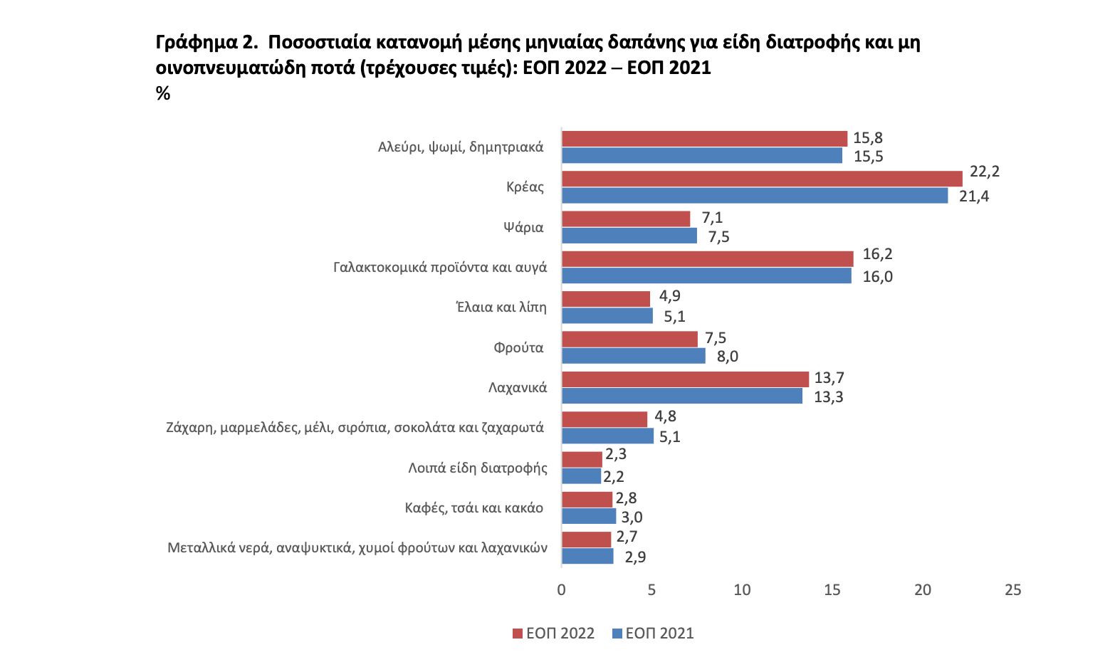 Μεταλλικά νερά, αναψυκτικά, χυμοί φρούτων και λαχανικών Καφές, τσάι και κακάο Λοιπά είδη διατροφής Ζάχαρη, μαρμελάδες, μέλι, σιρόπια, σοκολάτα και ζαχαρωτά Λαχανικά Φρούτα Έλαια και λίπη Γαλακτοκομικά προϊόντα και αυγά Ψάρια Κρέας Αλεύρι, ψωμί, δημητριακά ΕΟΠ 2022 ΕΟΠ 2021
