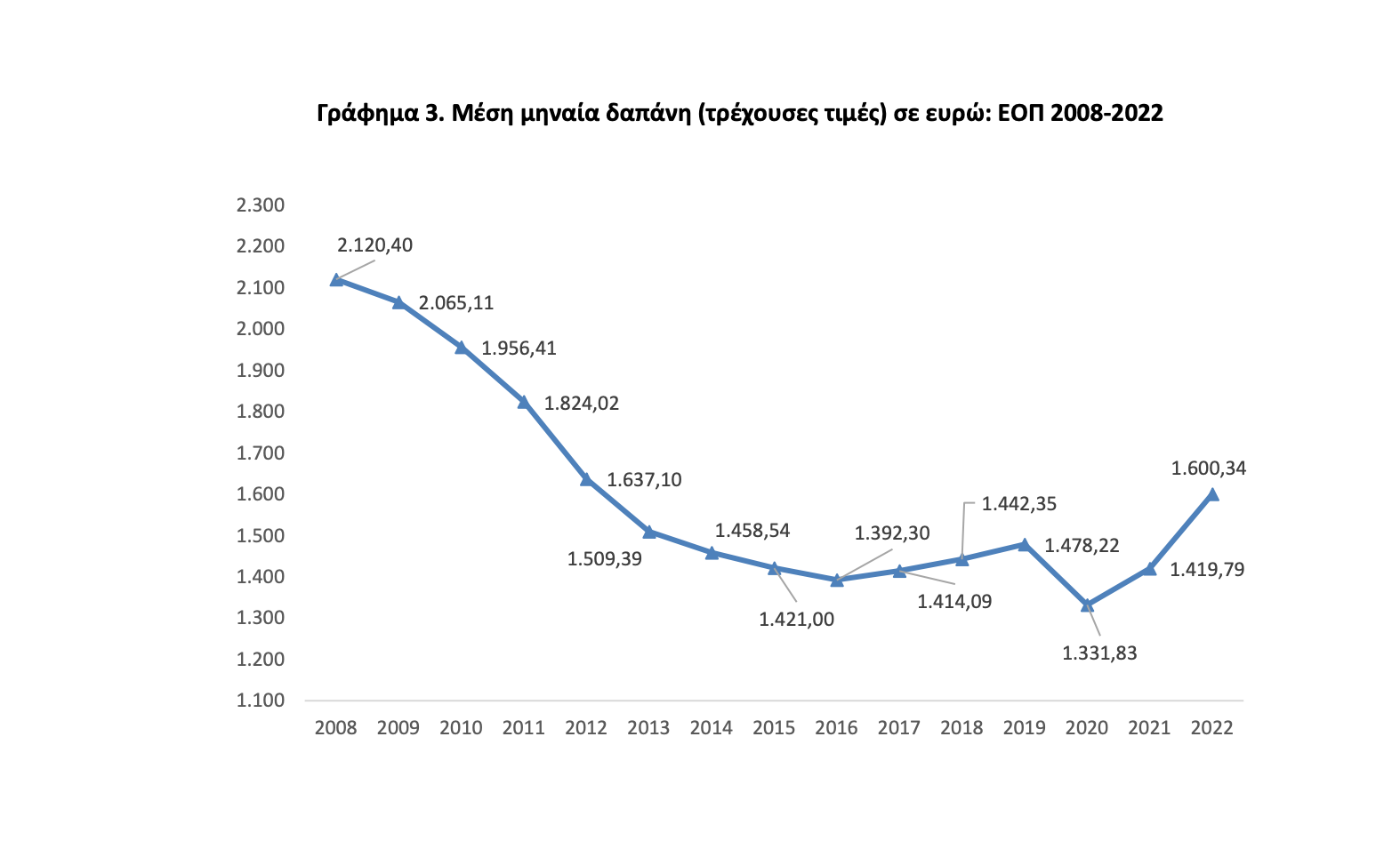 Γράφημα 3. Μέση μηναία δαπάνη (τρέχουσες τιμές) σε ευρώ: ΕΟΠ 2008-2022