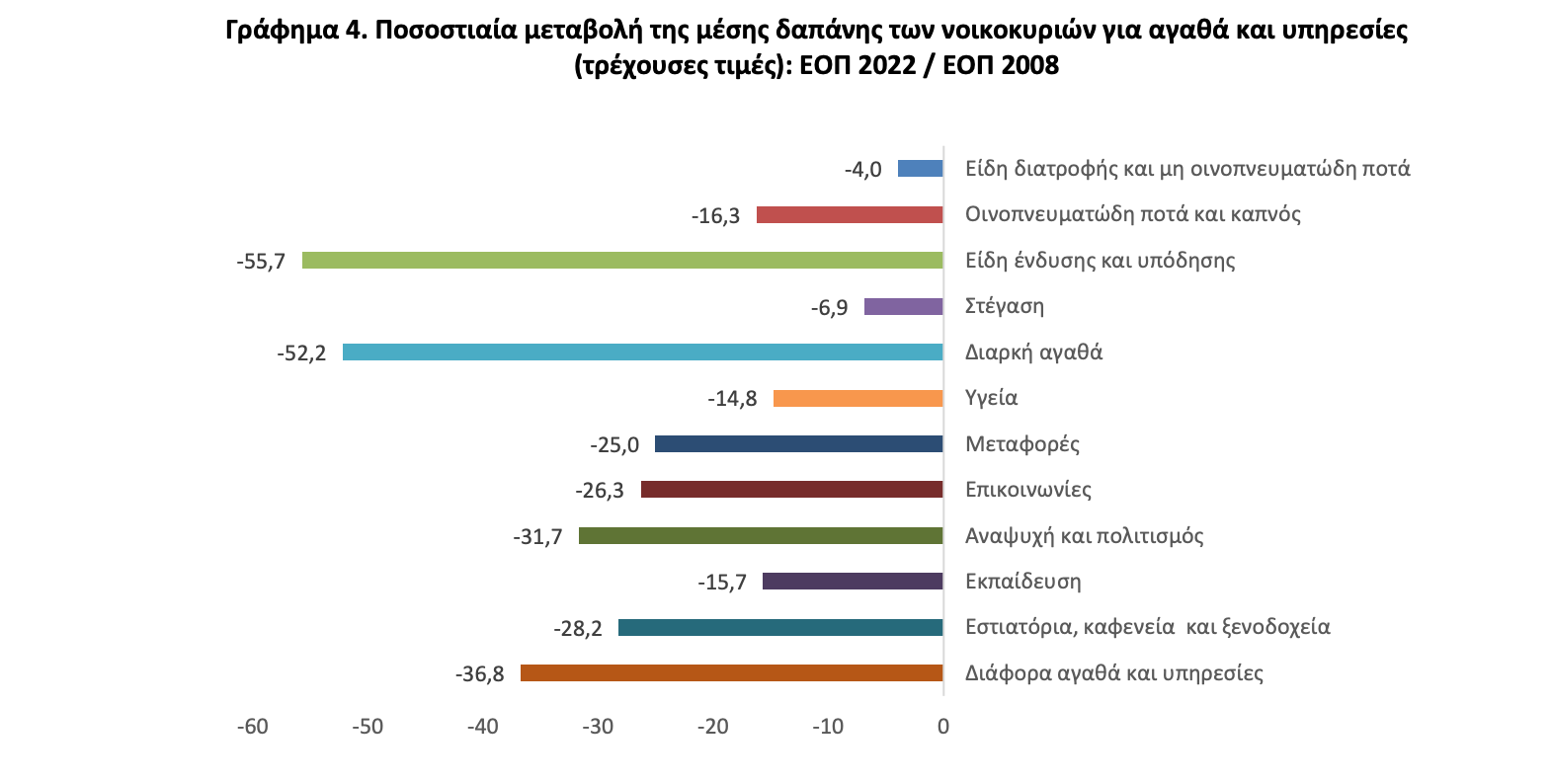 ένδυσης και υπόδησης (-55,7%) και την μικρότερη στα είδη διατροφής και μη οινοπνευματώδη ποτά