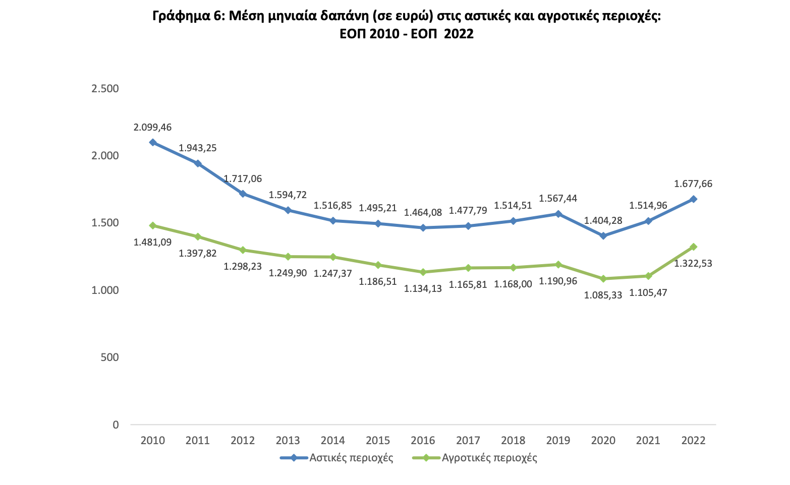 6 Τα νοικοκυριά με ένα άτομο μόνο, ηλικίας 65 ετών και άνω, δαπανούν, κατά μέσο όρο, το 45,9% της μέσης μηνιαίας δαπάνης των νοικοκυριών της Χώρας ενώ τα νοικοκυριά που αποτελούνται από ένα ζευγάρι με ένα παιδί έως και 16 ετών δαπανούν, κατά μέσο όρο, το 149,0% της μέσης μηνιαίας δαπάνης των νοικοκυριών της Χώρας (Πίνακας 7). Τα νοικοκυριά με υπεύθυνο οικονομικά μη ενεργό ή άνεργο δαπανούν, κατά μέσο όρο, το 70,3% της μέσης μηνιαίας δαπάνης των νοικοκυριών της Χώρας, ενώ αυτά με υπεύθυνο αυτοαπασχολούμενο με μισθωτούς το 226,2% αυτής (Πίνακας 8). Η μέση μηνιαία δαπάνη διαφέρει ανάλογα με την ηλικία του υπευθύνου του νοικοκυριού, με τα νοικοκυριά με υπεύθυνο ηλικίας 35-44 ετών να δαπανούν, κατά μέσο όρο, περισσότερο. Πιο συγκεκριμένα, τα νοικοκυριά αυτά δαπανούν, κατά μέσο όρο, το 132,2% της μέσης μηνιαίας δαπάνης των νοικοκυριών της Χώρας (129,4% το 2021). Τα νοικοκυριά με τη μικρότερη ποσοστιαία συμμετοχή (59,7%) για το 2022 ήταν αυτά με υπεύθυνο ηλικίας 75 ετών και άνω (60,2% το 2021) (Πίνακας 9). Δ. Πρότυπα κατανάλωσης ανάλογα με το βαθμό αστικότητας, την Περιφέρεια και το τρίμηνο διενέργειας της έρευνας Τα νοικοκυριά που διαμένουν σε αγροτικές περιοχές δαπανούν κατά μέσο όρο 1.322,53 ευρώ το μήνα, ενώ αυτά που διαμένουν σε αστικές περιοχές 1.677,66 ευρώ (Γράφημα 6). Επομένως, τα νοικοκυριά που διαμένουν σε αγροτικές περιοχές δαπανούν, κατά μέσο όρο, 21,2% λιγότερο από τα νοικοκυριά που διαμένουν σε αστικές περιοχές. Γράφημα 6: Μέση μηνιαία δαπάνη (σε ευρώ) στις αστικές και αγροτικές περιοχές: