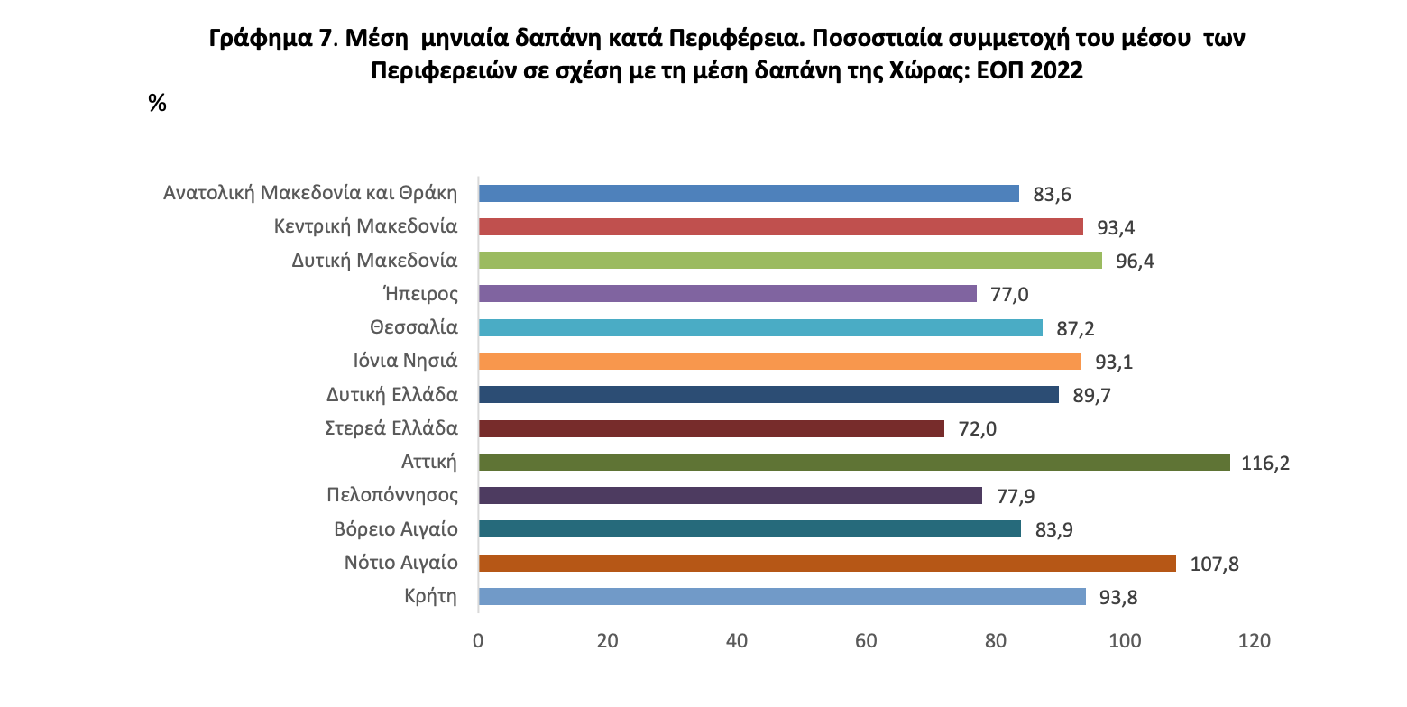 Τα νοικοκυριά που διαμένουν στην Περιφέρεια Αττικής δαπανούν, κατά μέσο όρο, το 116,2% της μέσης