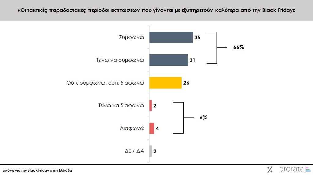 Αντί για τη Black Friday ο κόσμος προτιμά να ψωνίσει στις κλασικές εποχιακές εκπτωτικές περιόδους, κατά ένα 66%. Μόλις το 6% εξυπηρετείται από τη Black Friday.