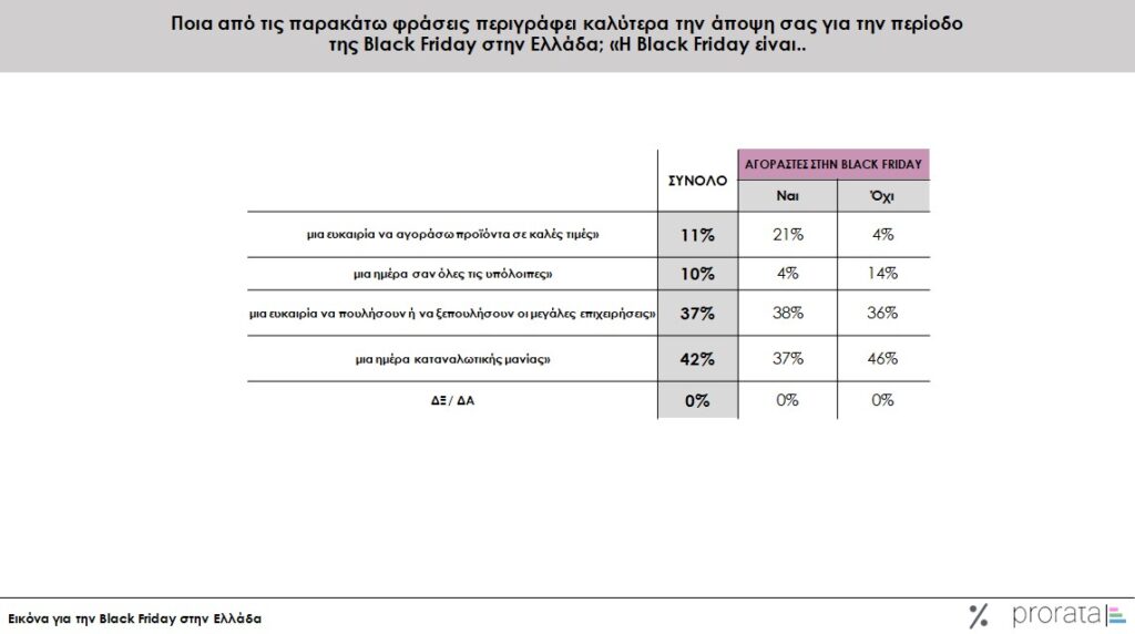 Μεγάλο ποσοστό των ερωτηθέντων θεωρούν την περίοδο της Black Friday ως μια ημέρα καταναλωτικής μανίας (42%). Επίσης, ένα 37% τη συνδυάζει με μια ευκαιρία των μεγάλων επιχειρήσεων ώστε να πουλήσουν.