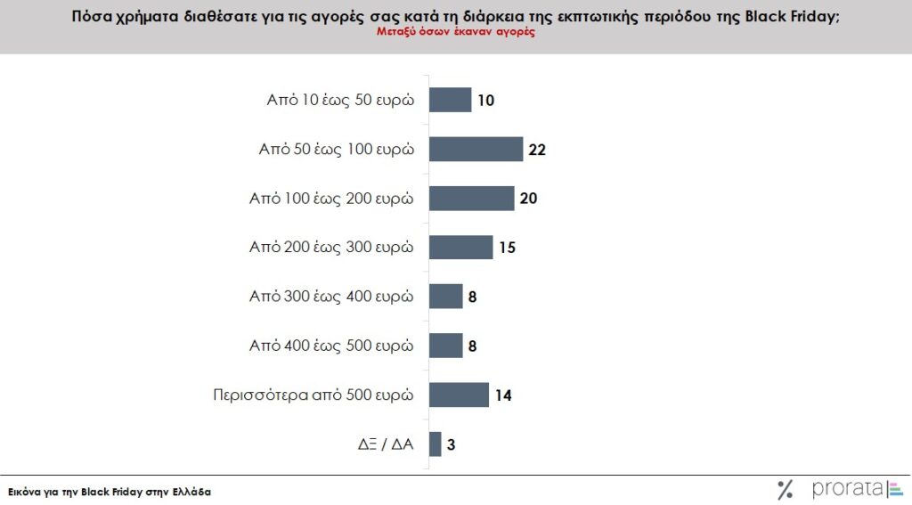 Οι μισοί από όσους απάντησαν ότι ψώνισαν δαπάνησαν κάτω από 100 ευρώ στη Black Friday. Ωστόσο, ένα σημαντικό ποσοστό 14% απάντησε ότι δαπάνησε πάνω από 500 ευρώ ενώ το 8% έδωσε μεταξύ 400 και 500 ευρώ στις αγορές του.