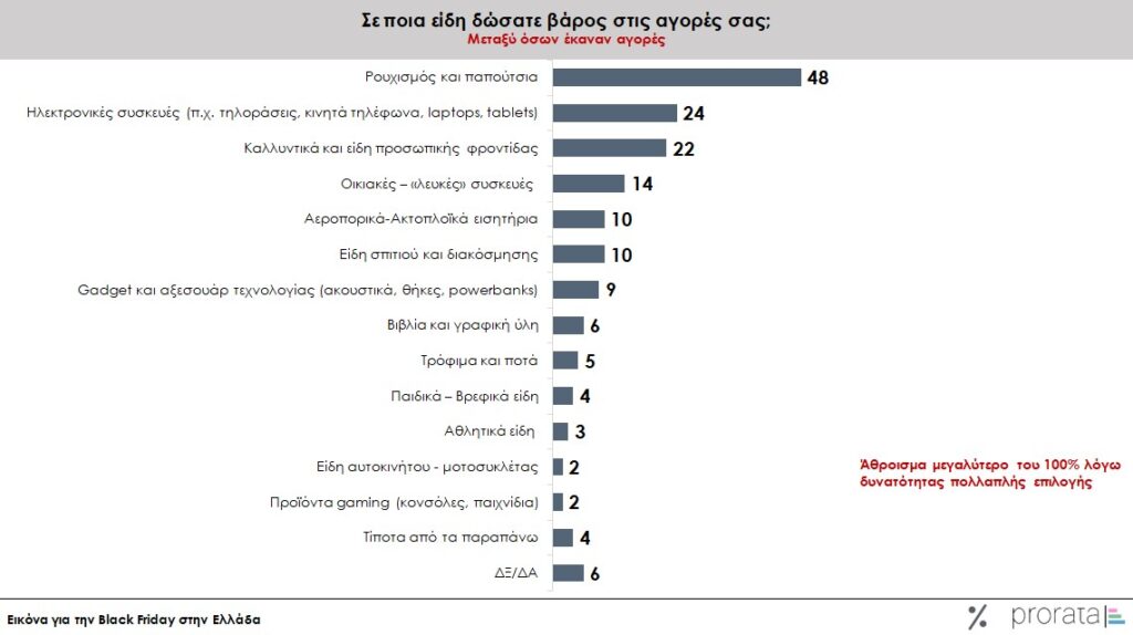 Ο ρουχισμός και τα παππούτσια κυριάρχησαν στις αγορές των καταναλωτών κατά 48% ενώ δεύτερη πιο αγαπημένη αγορά είναι οι ηλεκτρικές συσκευές (24%) μαζί με τα καλυντικά και είδη προσωπικής φροντίδας (22%).
