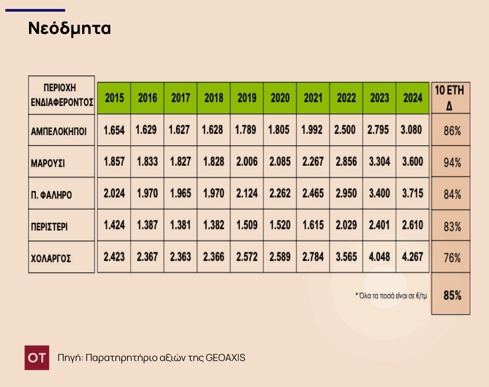 Όσον αφορά τα νεόδμητα ακίνητα και αναλυτικότερα τα διαμερίσματα μέσης επιφάνειας 105 τ.μ. η πιο ακριβή τιμή είναι ο Χολαργός με την τιμή ανά τετραγωνικό μέτρο να διαμορφώνεται στα 4.268 ευρώ/τ.μ., ενώ ακολουθούν το Παλαιό Φάληρο με 3.715 ευρώ/τ.μ., το Μαρούσι με 3.600 ευρώ/τ.μ., οι Αμπελόκηποι με 3.080 ευρώ/τ.μ. και το Περιστέρι με 2.610 ευρώ/τ.μ.