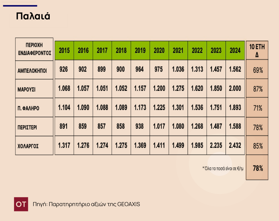 Από την άλλη πλευρά, τα διαμερίσματα παλαιότητας που έχουν ξεπεράσει την τέταρτη δεκαετία της ζωής τους η κατάταξη των περιοχών από την πιο ακριβή στην πιο φθηνή είναι περίπου η ίδια.
