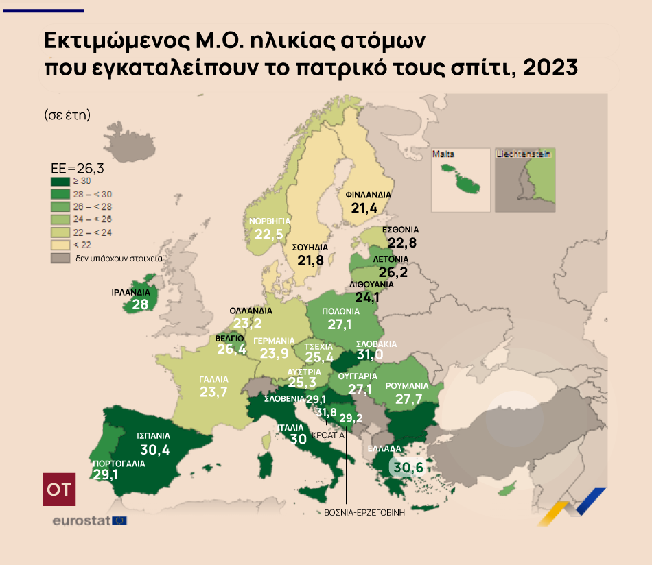 Ο μέσος Έλληνας μετακομίζει σε ηλικία 30,7 ετών και περισσότεροι νέοι ενήλικες ηλικίας 18-34 ετών ζουν με τους γονείς τους από ό,τι ο μέσος ευρωπαϊκός νέος ενήλικας.