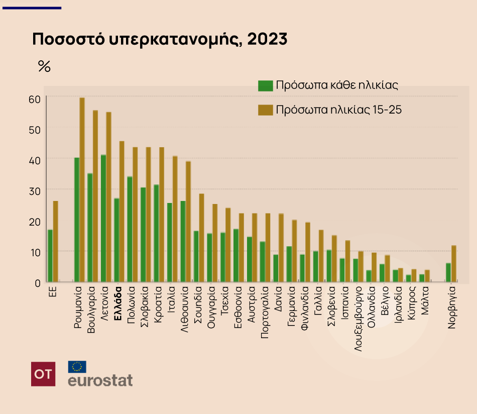 Αντίστοιχα, στην Ελλάδα, το ποσοστό των νέων (15-29 ετών) που ζούσαν σε υπερπλήρη νοικοκυριά ανήλθε το 2023 στο 46%, έναντι ποσοστού 27,5% για τον συνολικό πληθυσμό. Σε επίπεδο Ε.Ε., το σχετικό ποσοστό δεν ξεπερνά το 26%, ενώ το αντίστοιχο ποσοστό του συνολικού πληθυσμού που μένει σε υπερπλήρες νοικοκυριό διαμορφώνεται σε 16,8%.