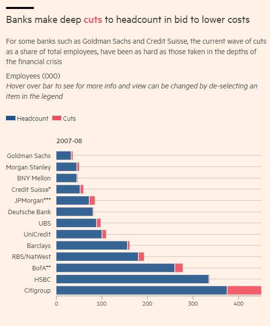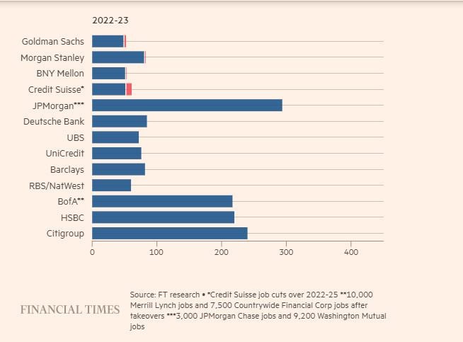 Μακράν οι μεγαλύτερες περικοπές που έχουν ανακοινωθεί μέχρι στιγμής όμως είναι από την Credit Suisse, με την ταλαιπωρημένη από τα σκάνδαλα ελβετική τράπεζα να βρίσκεται στο μέσον μιας στρατηγικής ριζικής ανανέωσης. Τον περασμένο Οκτώβριο, η τράπεζα ανακοίνωσε ότι θα καταργήσει 9.000 θέσεις από το 52.000μελές εργατικό δυναμικό της μέσα στις επόμενες τρεις εβδομάδες. Η αναδιάρθρωση της Credit Suisse είναι πιο εκτεταμένη από αυτή που πραγματοποιήθηκε κατά τη διάρκεια της χρηματοπιστωτικής κρίσης, όταν αναγκάστηκε να απολύσει πάνω από 7.000 υπαλλήλους το 2008, αλλά απέφυγε την κρατική διάσωση.