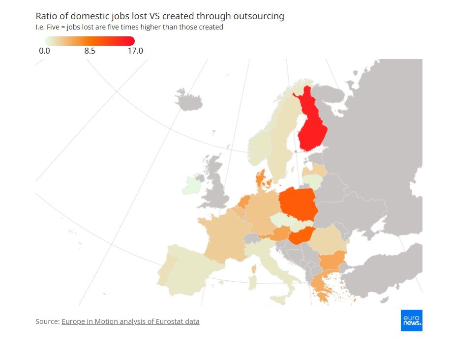 Σύμφωνα με πρόσφατη έκθεση της Eurostat που παρουσιάζει το Euronews, λόγω της εξωτερικής ανάθεσης οι χώρες της ΕΕ έχασαν μεταξύ 2021 και 2023 περίπου 150.000 θέσεις εργασίας, περίπου τρεις φορές περισσότερες από αυτές που δημιουργήθηκαν μέσω της ίδιας διαδικασίας την ίδια περίοδο.