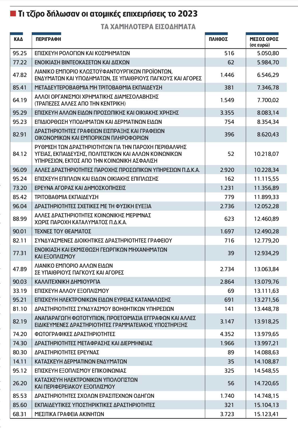 2) Στον αντίποδα, τα χαμηλότερα ποσά ετήσιων τζίρων (μέσους ετήσιους τζίρους κάτω από 10.000 ευρώ) δήλωσαν 396 ατομικές επιχειρήσεις γραφείων είσπραξης και γραφείων οικονομικών-εμπορικών πληροφοριών, 754 επιδιορθωτές υποδημάτων και δερματίνων ειδών, 3.355 επισκευαστές ειδών προσωπικής και οικιακής χρήσης, 1.549 ατομικές επιχειρήσεις χρηματικής διαμεσολάβησης, 381 ατομικές επιχειρήσεις παροχής υπηρεσιών εκπαίδευσης, 1.446 λιανέμποροι κλωστοϋφαντουργικών προϊόντων, ενδυμάτων και υποδημάτων σε υπαίθριους πάγκους και λαϊκές αγορές, 62 επιχειρήσεις ενοικίασης βιντεοκασετών και δίσκων και 516 επισκευαστές ρολογιών και κοσμημάτων.