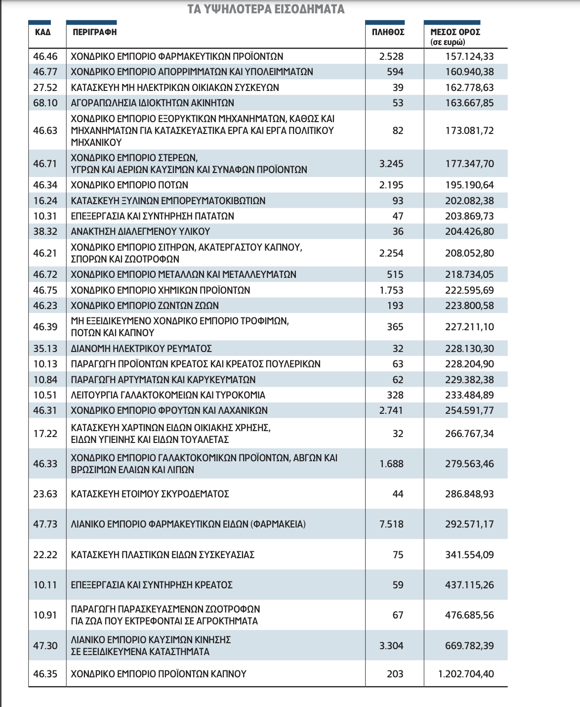 1) Τα υψηλότερα ποσά ετησίων ακαθαρίστων εσόδων δήλωσαν 203 χονδρέμποροι προϊόντων καπνού (μέσος τζίρος 1.202.704,40 ευρώ), 3.304 λιανέμποροι καυσίμων κίνησης (μέσος τζίρος 669.782,39 ευρώ), 67 παραγωγοί ζωοτροφών (μέσος τζίρος 476.685,56 ευρώ), 59 επιχειρήσεις επεξεργασίας και συντήρησης κρέατος (μέσος τζίρος 437.115,26 ευρώ), 75 κατασκευαστές πλαστικών ειδών συσκευασίας (μέσος τζίρος 341.554,09 ευρώ) και 7.518 φαρμακοποιοί (μέσος τζίρος 292.571,17 ευρώ).