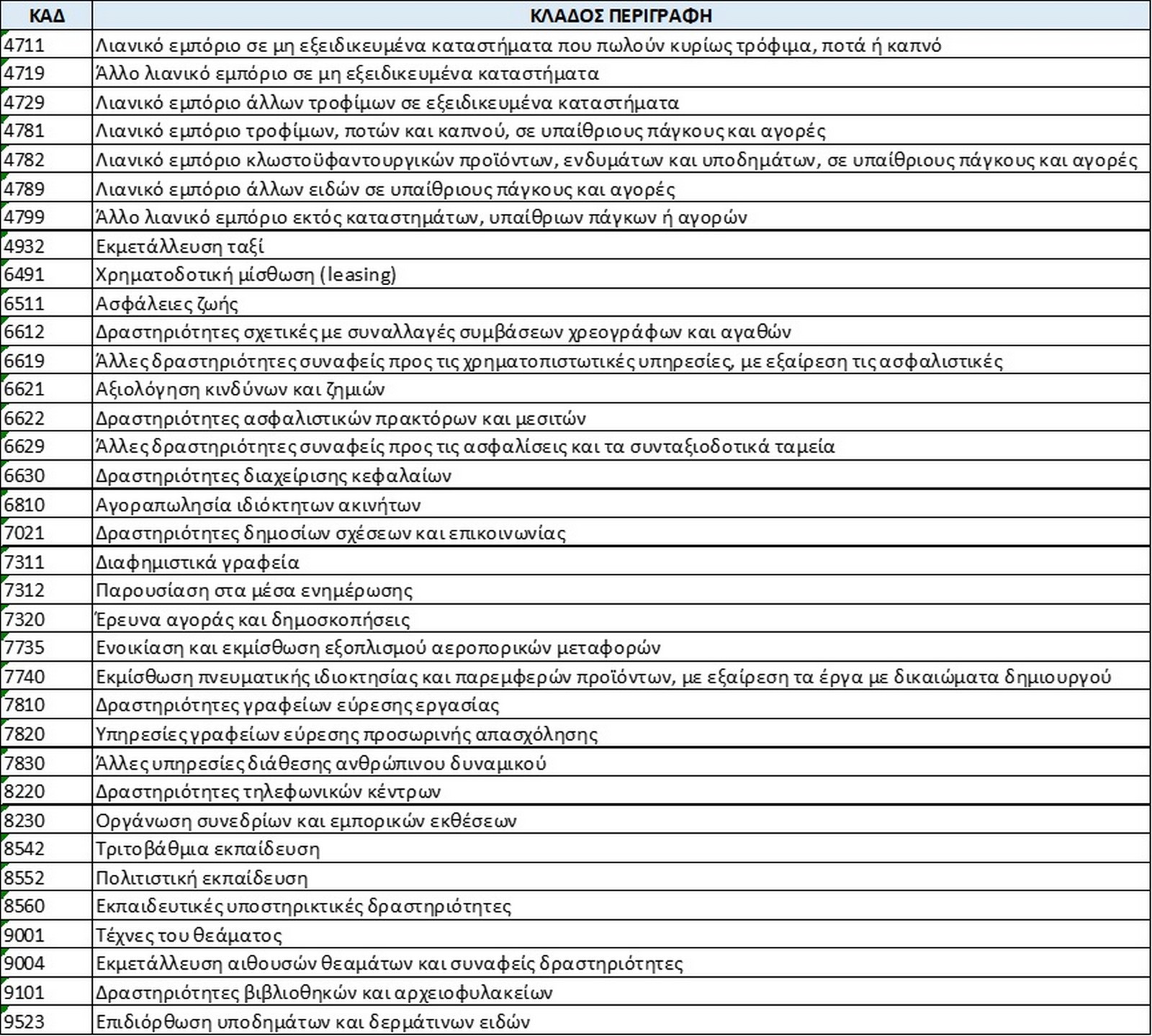 Σύμφωνα με την Κοινή Απόφαση των υπουργείων Εθνικής Οικονομίας και Ανάπτυξης που δημοσιεύτηκε σε ΦΕΚ στην το μέτρο επεκτείνεται υποχρεωτικά σε 35 νέες κατηγορίες επαγγελμάτων που σήμερα εξαιρούνται από την εγκατάσταση τερματικών. Στη λίστα περιλαμβάνονται μεταξύ άλλων ιδιοκτήτες ταξί, χρηματιστηριακοί σύμβουλοι, κτηματομεσίτες, παραγωγοί λαϊκών αγορών και πωλητές σε πανηγύρια, ιδιοκτήτες περιπτέρων, ψιλικών, παντοπωλείων, μεσίτες και ασφαλιστικοί πράκτορες στις αγοραπωλησίες ακινήτων, γραφεία ευρέσεως εργασίας, θέατρα, κινηματογράφοι, συναυλίες, τραγουδιστές, μουσικά συγκροτήματα, χορευτές, ιδιωτικά πανεπιστήμια, ΙΕΚ κ.α. Η απόφαση θα προβλέπει επίσης βαριά πρόστιμα έως 1.500 ευρώ κατά περίπτωση για τους επιτηδευματίες που δεν θα συμμορφωθούν.