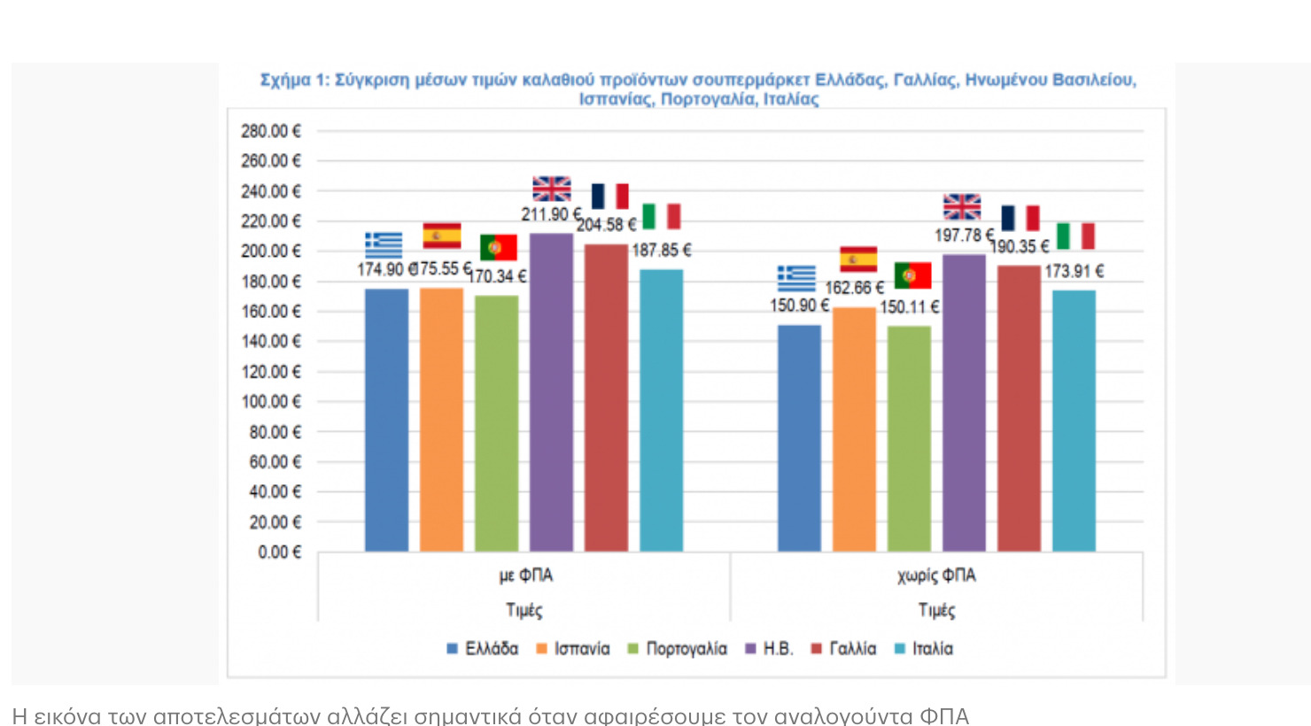 Η εικόνα των αποτελεσμάτων αλλάζει σημαντικά όταν αφαιρέσουμε τον αναλογούντα ΦΠΑ ανά χώρα για να γίνουν αντιληπτές τις πραγματικές τιμές των προϊόντων σουπερμάρκετ. Η σύγκριση των καλαθιών σε αυτή την περίπτωση (σχήμα 1 και πίνακας 1) δείχνει ότι οι και οι έξι χώρες έχουν πιο ακριβό μέσο καλάθι από την Ελλάδα, η Γαλλία κατά 26%, το Ηνωμένο Βασίλειο κατά 31%, η Ιταλία κατά 15%, η Ισπανία κατά 8% και η Πορτογαλία παραμένει φθηνότερη κατά 5% Αυτό είναι αποτέλεσμα της διαφοράς που έχει ο χαμηλός ΦΠΑ ανά χώρα (πρόκειται για τον ΦΠΑ που αναφέρεται σε τρόφιμα και ποτά). Στην Ελλάδα αυτός ο ΦΠΑ είναι 13%. Ο ΦΠΑ είναι σημαντικά υψηλότερος από το Ηνωμένο Βασίλειο (0% ή 5%) και τη Γαλλία (10% και 5,5%), την Ισπανία (10% και 4%), την Πορτογαλία (13% και 6%), την Ιταλία (5% και 4%), αλλά και τις περισσότερες χώρες της ΕΕ.