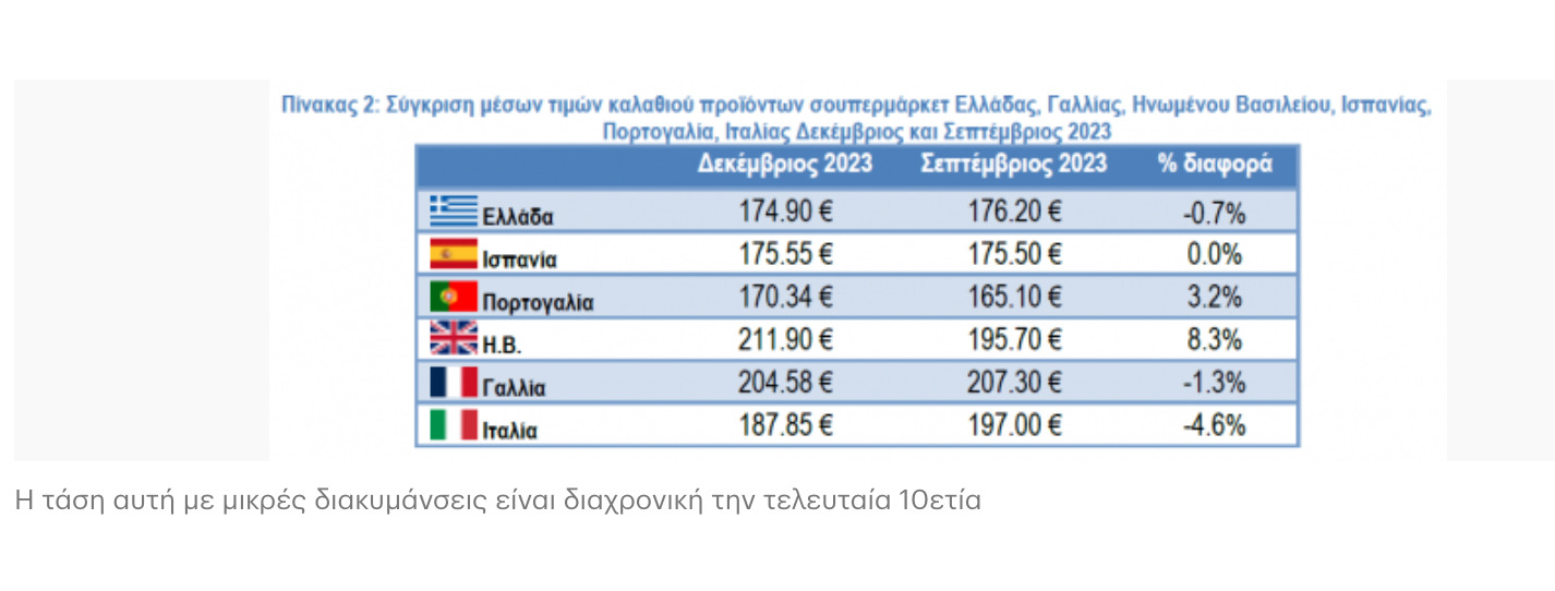 Η σύγκριση των μέσων τιμών των καλαθιών (πίνακας 1) δείχνει ότι και οι τρεις χώρες έχουν σημαντικά ακριβότερο μέσο καλάθι από την Ελλάδα, 17% η Γαλλία, 21% το Ηνωμένο Βασίλειο, 7% η Ιταλία, η Ισπανία είναι στα ίδια επίπεδα με την Ελλάδα, ενώ η Πορτογαλία είναι φθηνότερη κατά 3% με την Ελλάδα.