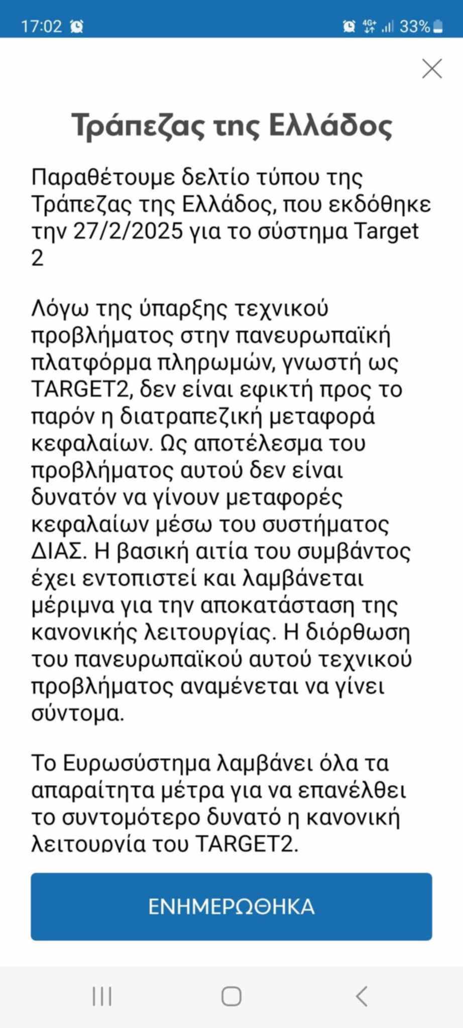 Προβλήματα κατά την διατραπεζική μεταφορά κεφαλαίων λόγω τεχνικού προβλήματος