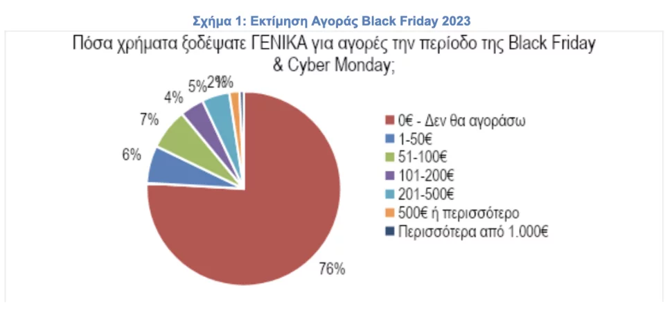 Όσον αφορά το ύψος της εκτιμώμενης δαπάνης για αγορές την περίοδο του black Friday για όσους επέλεξαν να αγοράσουν, αυτή μεσοσταθμικά εκτιμάται σε 257€ κατά κεφαλήν. Πρόκειται για μια συνολική εκτίμηση δαπάνης άνω των 200 εκατ. ευρώ. Tο 76% δεν δαπάνησε τίποτα, το 6% μέχρι 50 ευρώ, το 7% έως 100 ευρώ, το 4% από 100 έως 200 ευρώ, το 5% από 200 έως 500 ευρώ, το 2% από 500 έως 1.000 ευρώ και το 1% πάνω από 1.000 ευρώ.