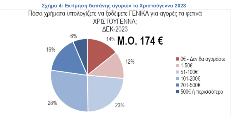 Η δαπάνη της περιόδου των Χριστουγέννων αναμένεται να είναι αυξημένη. Συγκεκριμένα όπως καταγράφεται στο σχήμα 4, μεσοσταθμικά το κοινό αναμένεται να ξοδέψει 174 ευρώ κατά κεφαλήν, το οποίο είναι αυξημένο κατά 20% σε σχέση με τα 146 ευρώ του 2022. Η αύξηση αυτή αποδίδεται κυρίως στις πληθωριστικές πιέσεις που καταγράφουν οι τιμές, αλλά και στη μικρή αύξηση που καταγράφει το μέσο εισόδημα των καταναλωτών.
