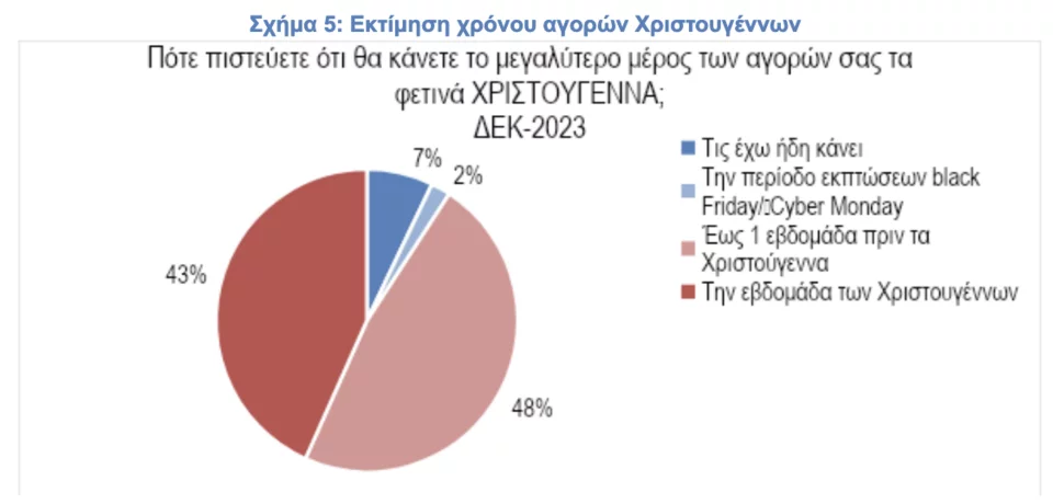Η συντριπτική πλειοψηφία των αγορών αναμένεται να πραγματοποιηθεί έως μία εβδομάδα πριν τα Χριστούγεννα 48% ή την εβδομάδα των Χριστουγέννων 43%, με ένα μεγάλο ποσοστό του κοινού να περιμένει το δώρο των Χριστουγέννων για να μπορέσει να κάνει τις εορταστικές αγορές του.