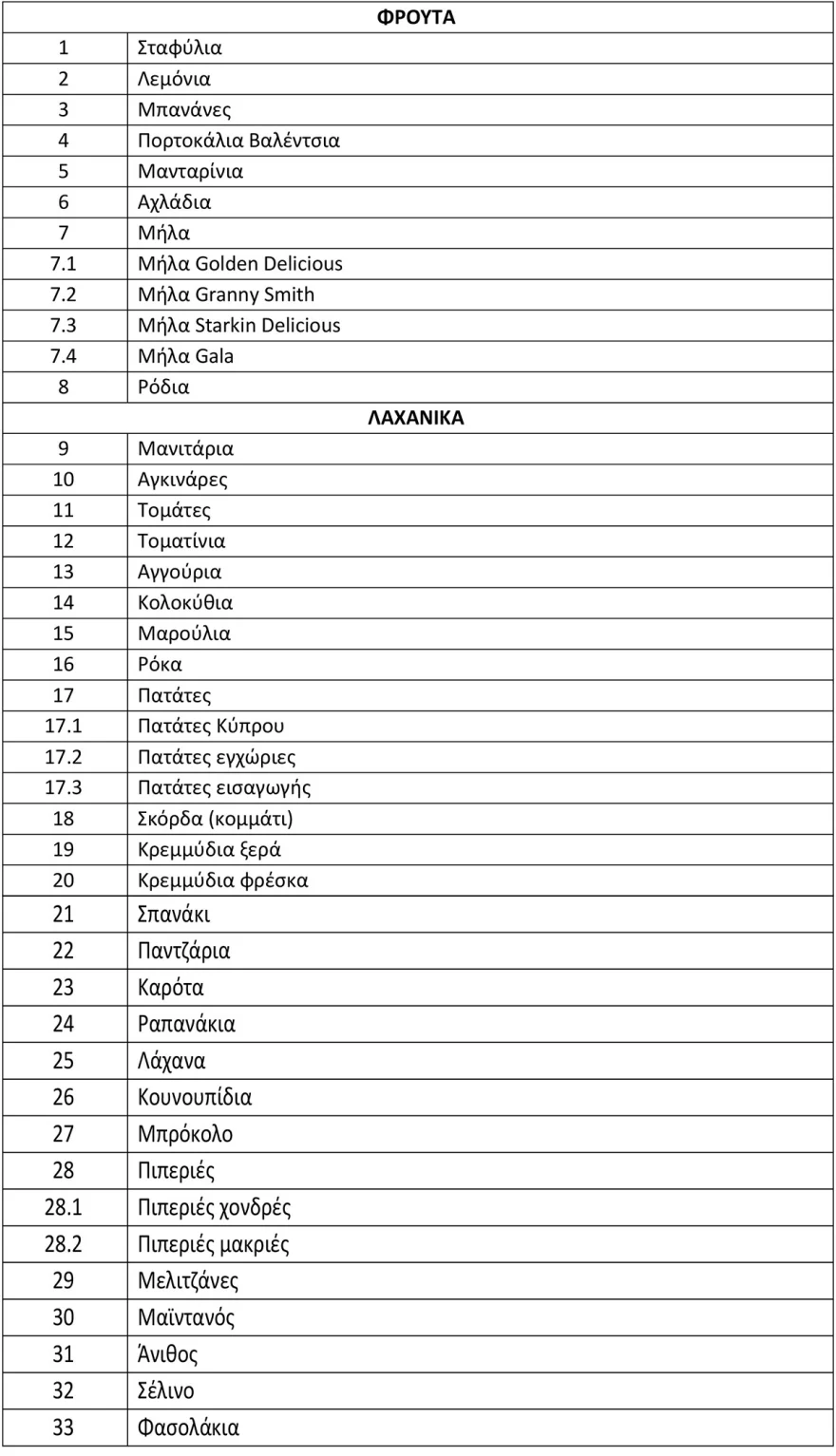 Στην Υπουργική Απόφαση καθορίζονται οι κατηγορίες των οπωροκηπευτικών προϊόντων για τις οποίες προβλέπεται ανακοίνωση λιανικών τιμών πώλησης στο Υπουργείο Ανάπτυξης