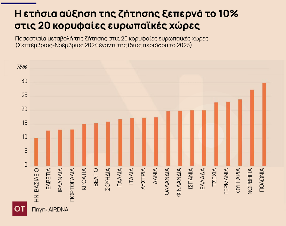 Σύμφωνα με τα στοιχεία της εξειδικευμένης εταιρείας AirDNA, η Ελλάδα με διψήφιο ποσοστό αύξησης 20,1% σε επίπεδο ζήτησης, συγκριτικά με το αντίστοιχο περσινό διάστημα, κατατάσσεται στην έκτη θέση μεταξύ των 20 υπό εξέταση ευρωπαϊκών κρατών.
