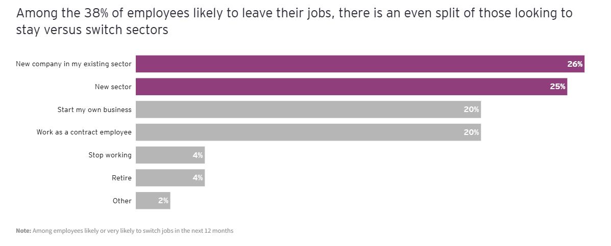 Το 38% των ερωτηθέντων δηλώνουν ότι είναι πιθανό να εξετάσουν το ενδεχόμενο παραίτησης στη διάρκεια των επόμενων 12 μηνών, με το 26% να επιθυμούν να παραμείνουν στον τομέα που απασχολούνται σήμερα, και το 25% να αναζητούν ευκαιρίες σε νέους τομείς. Αυτή η τάση, είναι ιδιαίτερα έντονη στους millennials (40%), σε σύγκριση με τους baby boomers (23%).