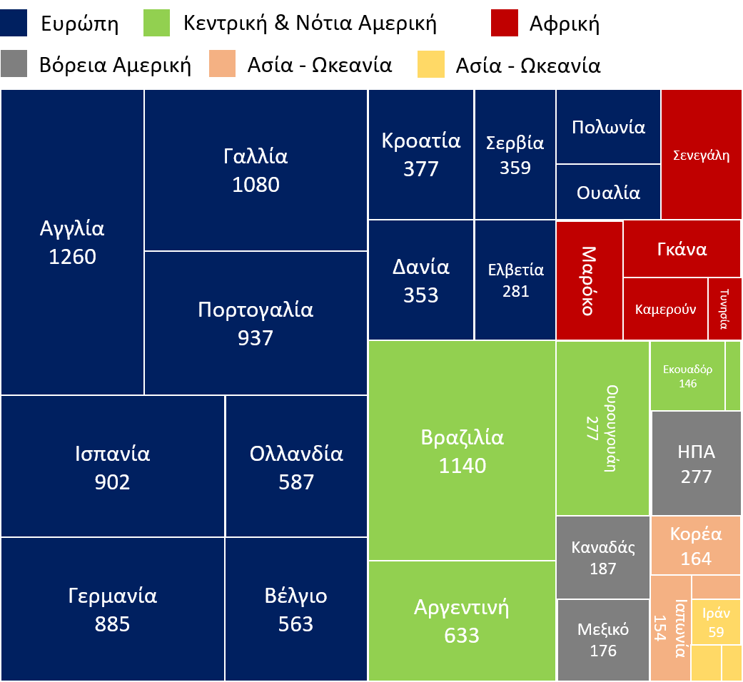 Λαμβάνοντας την αξία των ομάδων σε εκατομμύρια ευρώ προκύπτει ότι τα 2/3 της συνολικής αξίας έρχεται από παίκτες της Ευρώπης. Πρώτη είναι η Αγγλία με 1260 εκατομμύρια ευρώ με την Βραζιλία να έρχεται δεύτερη με 1140 εκατομμύρια ευρώ. Την πρώτη τριάδα κλείνει η Πορτογαλία με αξία 937 εκατομμύρια ευρώ.