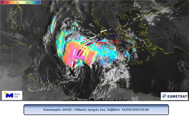 - Λόγω της αβεβαιότητας που παρουσιάζουν προγνωστικά οι μεταβατικές εποχές, και λόγω της παρούσας θέσης της ατμοσφαιρικής διαταραχής (βρίσκεται πάνω από θάλασσα), δεν είναι ακόμα σαφής η τροχιά που θα ακολουθήσει. Στο χάρτη που ακολουθεί παρουσιάζονται τα 4 επικρατέστερα σενάρια σχετικά την τροχιά που θα ακολουθήσει το κέντρο του βαρομετρικού χαμηλού έως τις 03:00 τα ξημερώματα του Σαββάτου 19/09.
