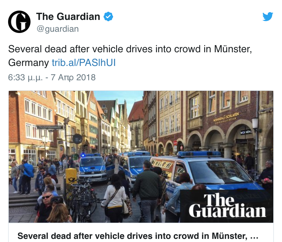 Δύο άνθρωποι, μια γυναίκα 51 ετών και ένας άνδρας 65, σκοτώθηκαν και άλλοι 20 τραυματίστηκαν το Σάββατο, όταν ένας 48χρονος, γερμανός πολίτης, έριξε το μίνιβαν στο τιμόνι του οποίου βρισκόταν πάνω στο πλήθος που ήταν καθισμένο στο εξωτερικό εστιατορίου στο πολυσύχναστο, τουριστικό, εμπορικό κέντρο του Μίνστερ -μιας πόλης που φιλοξενεί δεκάδες χιλιάδες φοιτητές- πριν αυτοκτονήσει μέσα στο Φολκσβάγκεν με το οποίο διέπραξε την επίθεση.
