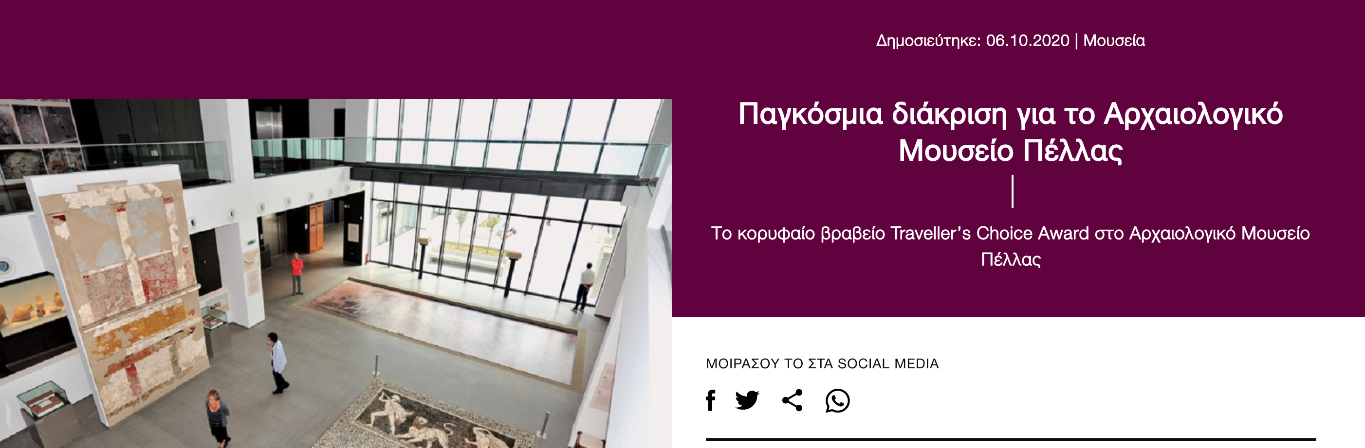 Μια πραγματικά ενδιαφέρουσα ιστορία εξελίσσεται σήμερα σε σχέση με τον πολιτισμό. Με ένα τηλεγράφημα του ΑΠΕ πληροφορηθήκαμε ότι παγκόσμια διάκριση για το Αρχαιολογικό Μουσείο Πέλλας που βραβεύτηκε με το «Traveller’s Choice Award» του Tripadvisor με το βραβείο επισκεπτών «Traveller’s Choice Award» του Tripadvisor για το 2020.