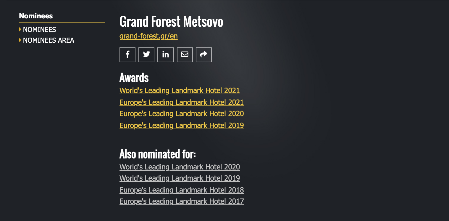 Το Grand Forest Metsovo από χθες, είναι το κορυφαίο landmark ξενοδοχείο του κόσμου -και μάλιστα με τα διαπιστευτήρια των World Travel Awards 2021.