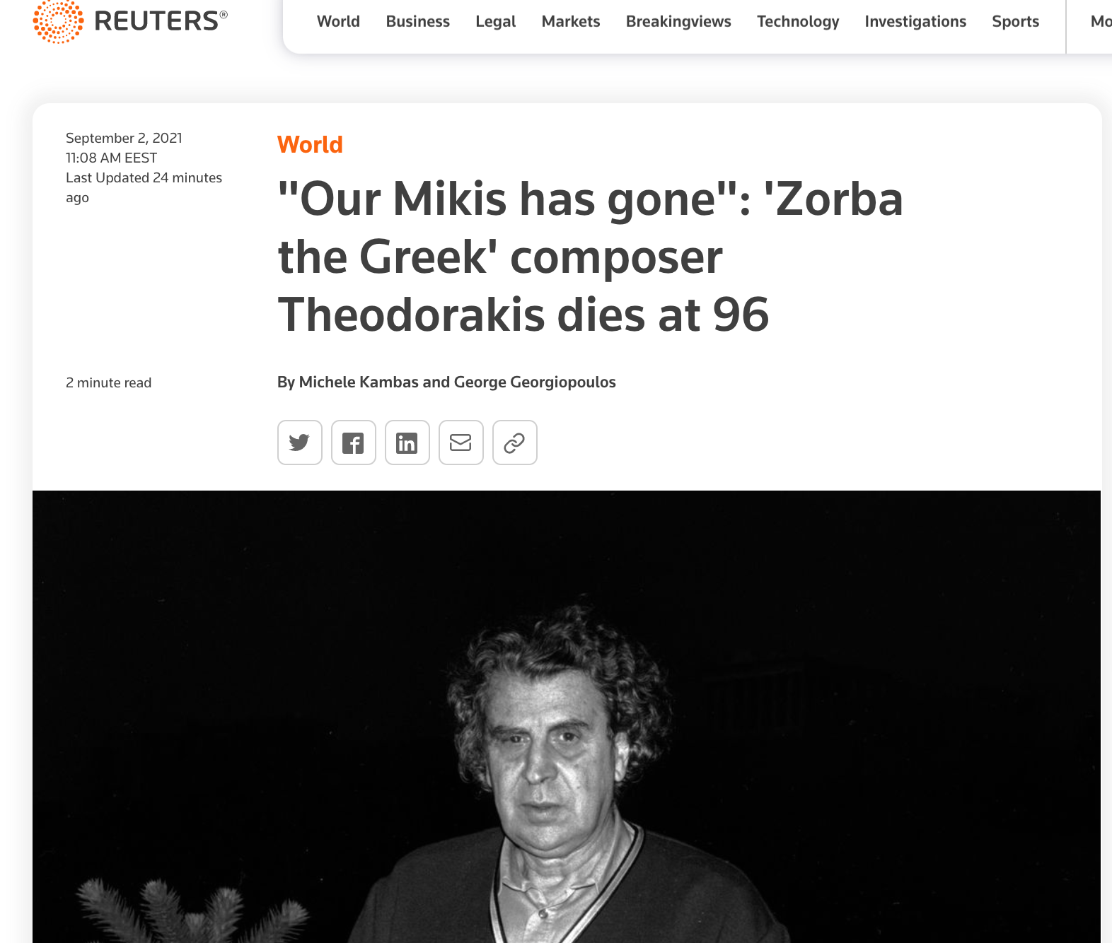 To πρακτορείο ειδήσεων Reuters αναφέρει με τίτλο «ο Έλληνας συνθέτης του Ζορμπά πεθαίνει σε ηλικία 96 ετών»,και σχολιάζει συνοπτικά στη ζωή του Μίκη Θεοδωράκη.