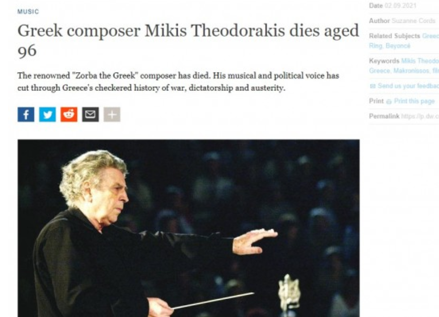 «Κανένας άλλος δεν κατάφερε να ερμηνεύσει την ελληνική νοοτροπία με τόσο πρωτότυπο τρόπο και να την κάνει γνωστή σε όλον τον κόσμο. Όμως ο Μίκης Θεοδωράκης δεν ήταν απλώς ένας συνθέτης, ένας μουσικός και μαέστρος. Ήταν αντιστασιακός και πολιτικός», σημειώνει το περιοδικό και παραθέτει βιογραφικά στοιχεία του συνθέτη, ενώ τονίζει ότι στην Ελλάδα τα ΜΜΕ έχουν διακόψει τη ροή του προγράμματός τους και προβάλλουν ειδικά αφιερώματα.