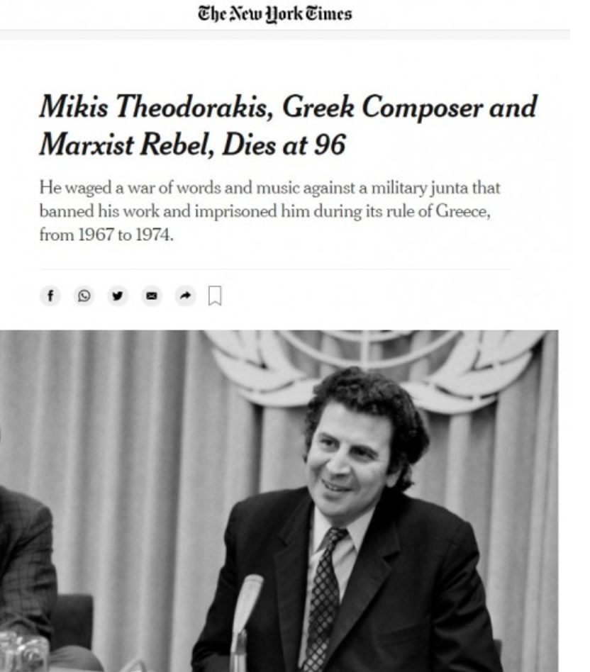 The New York Times: Πέθανε στα 96 του ο Μίκης Θεοδωράκης, Έλληνας συνθέτης και μαρξιστής αγωνιστής