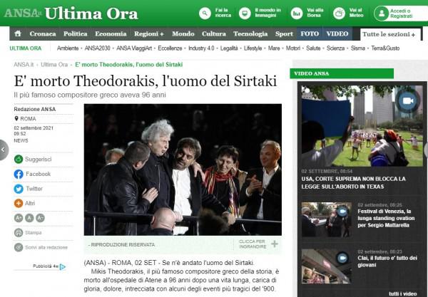Πρώτη είδηση αποτελεί στα μέσα ενημέρωσης της Ιταλίας, ο θάνατος του Μίκη Θεοδωράκη.