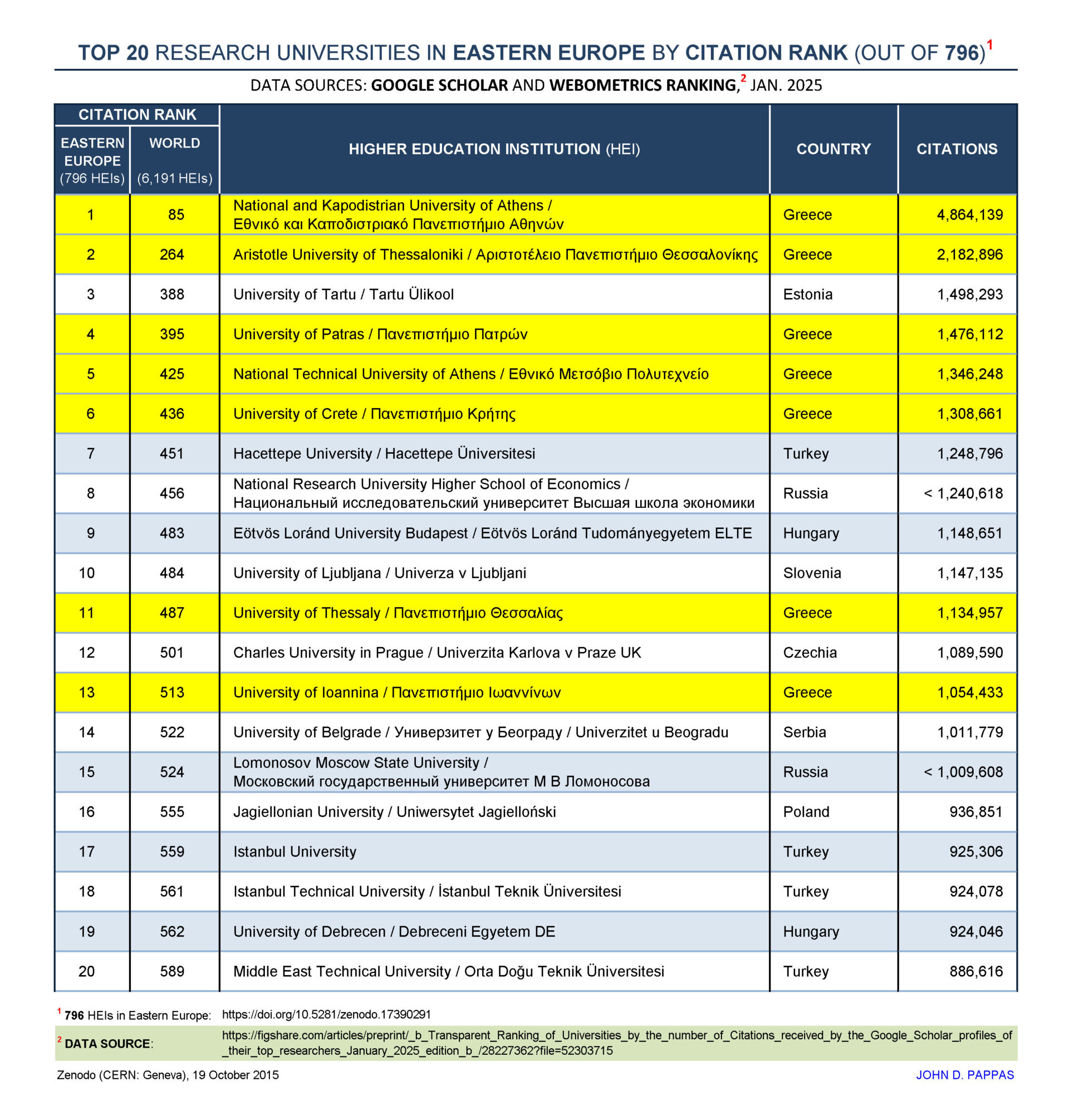 Επτά ελληνικά πανεπιστήμια συγκαταλέγονται μεταξύ των κορυφαίων της Ανατολικής Ευρώπης, σύμφωνα με τα στοιχεία της διεθνούς κατάταξης Webometrics Ranking (Google Scholar, Ιανουάριος 2025).